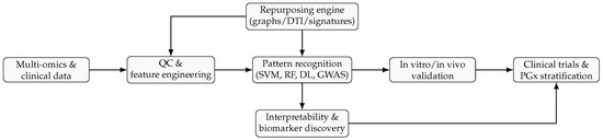 | Knowledge graphs/ network mining | Drug–target, PPI, pathway graphs | Mechanistic paths; explainability; rapid hypothesis generation | Knowledge bias; incomplete graphs | [4,5] |