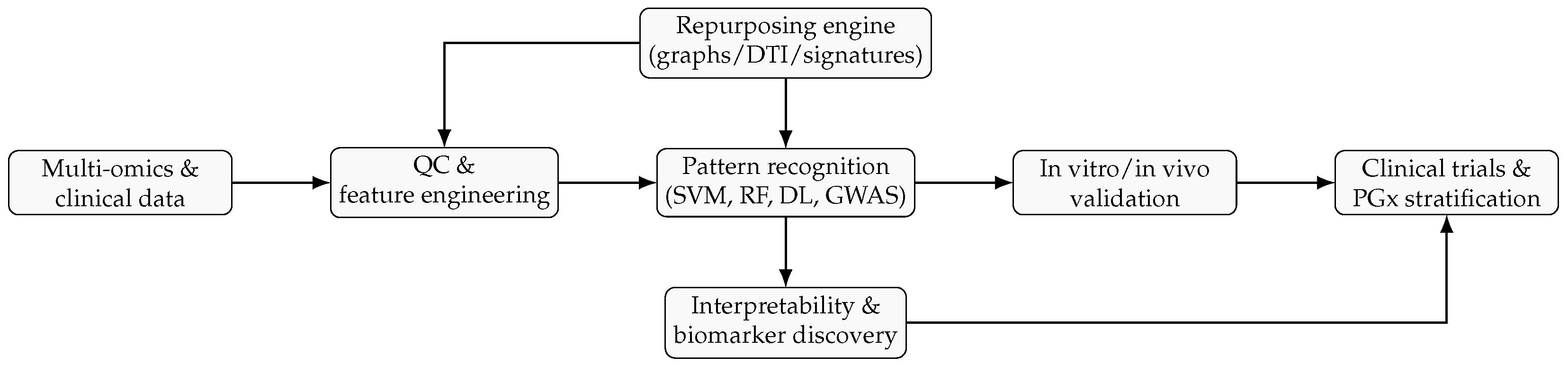 - Algorithms for causality and interpretability: One key limitation of current AI approaches in pharmacogenomics and drug repurposing is their reliance on correlational patterns. Future models must incorporate causal reasoning to distinguish confounding from true biological effects. Furthermore, interpretability is not optional. Clinicians and regulators need to understand why a model recommends a certain drug for a given patient or condition. Causal inference methods (e.g., structural causal models and counterfactual analysis), interpretable ML techniques (e.g., attention visualization and SHAP values), and hybrid approaches that embed mechanistic biological knowledge (e.g., pathway-aware networks) are all promising directions to enhance the transparency and trustworthiness of pattern recognition in biomedicine.
