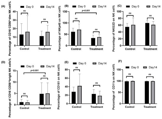 Figure 1. Peripheral blood mononuclear cells (PBMCs) were collected from ten cancer patients at baseline (Day 0) and after 14 days of Juzentaihoto (JTT) treatment (Day 14). For comparison, samples from ten healthy volunteers, who did not receive JTT, were obtained at the same time points (Day 0 and Day 14). Cells were stained with fluorochrome-conjugated antibodies and analyzed by flow cytometry to assess NK-cell subsets and activation/adhesion markers. Panels show the percentage of (A) CD56^dim NK cells, (B) NKp46+ NK cells, (C) NKG2D+ NK cells, (D) CD56^bright NK cells, (E) CD161+ NK cells, and (F) CD11a+ NK cells. Data are presented as mean ± SD with 95% confidence intervals (n = 10). Statistical comparisons between Day 0 and Day 14 were performed using two-tailed paired t-tests. ns, not significant. Marker expression for NKp46, NKG2D, CD161, and CD11a Panels (B,C,E,F) was evaluated in both CD56^dim and CD56^bright NK-cell subsets. Representative gating plots are provided in Supplementary Figure S1, and corresponding numerical data are summarized in Supplementary Table S2.