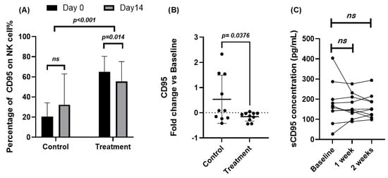 Figure 2. Effects of Juzentaihoto (JTT) on CD95 expression in NK cells and serum Fas ligand (FasL) levels in cancer patients. (A) Percentage of CD95+ NK cells in ten cancer patients and ten healthy volunteers at baseline (Day 0) and after 14 days of JTT administration, determined by flow cytometry. Statistical comparison between Day 0 and Day 14 was performed using paired t-tests. (B) Fold change in CD95 expression [(Day 14 − Day 0)/Day 0] in control and patient groups. Between-group comparison was assessed using unpaired t-tests. (C) Serum Fas ligand (FasL, pg/mL) levels measured by ELISA at baseline, 1 week, and 2 weeks after JTT administration in cancer patients. Each post-treatment time point was compared with baseline using paired t-tests. No significant differences were observed in FasL concentrations, with p = 0.54 at 1 week and p = 0.57 at 2 weeks after JTT administration. Data are expressed as mean ± SD with 95% confidence intervals. ns, not significant; p < 0.05, statistically significant.