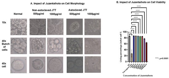 We also established optimized preparation conditions for in vitro experiments. Specifically, JTT must be autoclaved in PBS and used at concentrations below 100 µg/mL. This method is simple, reproducible, and preserves the biological activity of the JTT components without inducing cytotoxicity at working doses. These features are consistent with those of previous reports emphasizing the importance of autoclaving in herbal extract research [47,48,49]. Prior studies have confirmed that JTT at concentrations under 100 µg/mL is non-toxic and retains immunomodulatory effects in immune cell models [50,51]. Additionally, using PBS as a solvent helps maintain preparation stability, while avoiding potential bioactivity interference from organic solvents.