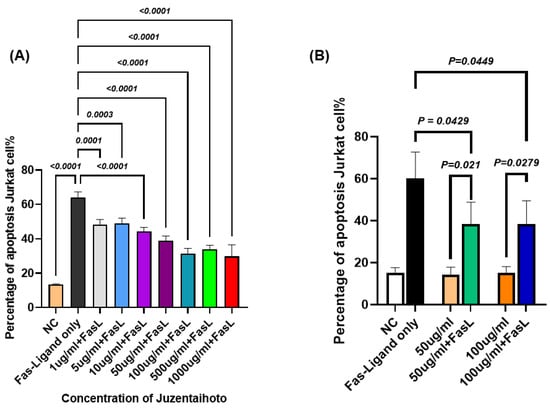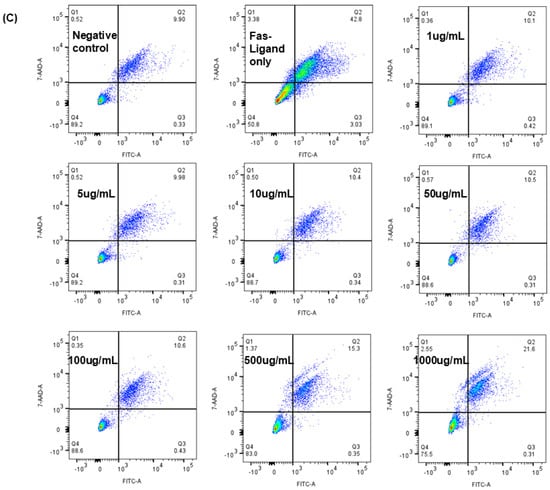 In non-autoclaved JTT, the cells tended to aggregate into grape-like clusters, and active cell movement was observed. From 1 µg/mL to 1000 µg/mL, cells maintained a full state and exhibited normal morphology, similar to the negative control. In contrast, with autoclaved JTT, cells cultured between 1 µg/mL and 100 µg/mL also maintained a full state and grape-like clustering. However, at higher concentrations (500 µg/mL and 1000 µg/mL), numerous cell fragments were observed, indicating disruption of cell connectivity. At 1000 µg/mL, Jurkat cells were severely damaged, with numerous cell fragments and dead cells visible. Comparing the two conditions, it was found that non-autoclaved JTT, even at high concentrations, did not exhibit any pharmacological effects, unlike autoclaved JTT. Therefore, subsequent experiments were conducted using autoclaved JTT. To evaluate the effects of autoclaved JTT on Jurkat cells, cells were seeded at a density of 1 × 106 cells/mL into culture plates containing JTT at concentrations of 1 µg/mL, 5 µg/mL, 10 µg/mL, 50 µg/mL, 100 µg/mL, 500 µg/mL, and 1000 µg/mL. Two additional culture plates were used as negative and FasL-only controls, containing only Phosphate-buffered saline (PBS) and culture medium. After 72 h, the cells were harvested and analyzed by flow cytometry to assess their viability. For comparison, the FasL was added to the FasL-only control wells 24 h prior to collection. As shown in Figure 3B, all concentrations of JTT resulted in significantly higher cell viability than the FasL-only control (p < 0.0001). When compared to the negative control, which had a viability rate of 85.83%, treatment groups at 1 µg/mL, 5 µg/mL, 10 µg/mL, 50 µg/mL, and 100 µg/mL showed similar or slightly higher viability rates of 86.96%, 86.67%, 86.27%, 85.3%, and 85.43%, respectively. In contrast, the groups treated with 500 µg/mL and 1000 µg/mL showed reduced viability, at 77.5% and 64.73%, respectively.