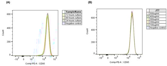 To assess whether the duration of culture affects CD95 expression in Jurkat cells, cells were treated with 100 µg/mL JTT and incubated for 24, 48, and 72 h. The control group was cultured in PBS under identical conditions. As shown in Figure 5A, the CD95 expression peak remained stable over time, with no significant differences between time points or compared with the control group (p > 0.05). These findings indicate that prolonged culture, with or without JTT, did not alter CD95 surface expression in Jurkat cells.