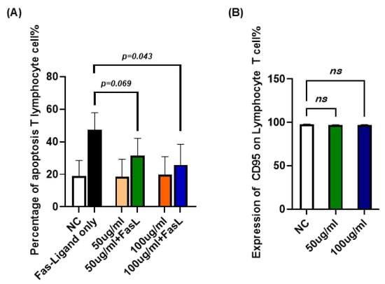 Figure 6. Effect of JTT on FasL-induced apoptosis in human peripheral T lymphocytes. (A) Percentage of apoptotic T lymphocytes after treatment with FasL alone (FasL-only), JTT alone (50 µg/mL or 100 µg/mL), or JTT in combination with FasL. NC: negative control (no FasL, no JTT). (B) Comparison of the expression of CD95 on T lymphocyte (Negative control, 50 or 100 µg/mL). Values are represented as mean ± SD from independent donors.
