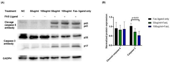 To investigate the molecular mechanisms underlying the protective effects of JTT against FasL-induced apoptosis, Jurkat cells were cultured under previously described conditions. On the final day, the cells were harvested, lysed, and the total protein was extracted. Protein concentrations were quantified and equal amounts were subjected to Western blot. Antibodies against cleaved caspase-8 and caspase-3 were used to detect the activation of the extrinsic apoptosis pathway. As shown in Figure 7A, FasL treatment induced cleavage of both caspase-8 (bands at p43/p41) and caspase-3 (band at p17), indicating activation of the apoptotic cascade. In the presence of JTT, especially at 100 µg/mL, the cleaved caspase-3 (p17) band intensity was markedly reduced. At 50 µg/mL, a decreasing trend was observed, though less pronounced. Densitometric analysis (Figure 7B) confirmed that the level of cleaved caspase-3 (p17), normalized to GAPDH, significantly decreased in the 100 µg/mL JTT + FasL group compared to the FasL-only group, while 50 µg/mL showed a modest reduction. These findings suggested that JTT inhibited Fas-mediated apoptosis in Jurkat cells, possibly by attenuating downstream caspase-3 activation.