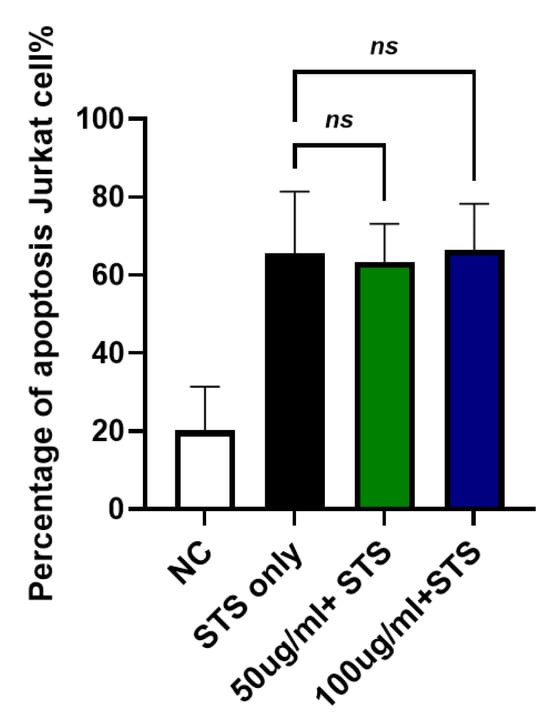 To investigate whether JTT affects intrinsic apoptosis, Jurkat cells were treated with staurosporine, a known inducer of the intrinsic apoptotic pathway, instead of FasL. As shown in Figure 8, staurosporine treatment (STS-only) markedly increased apoptosis (mean: 65.50%). However, the addition of JTT at both 50 µg/mL (63.29%) and 100 µg/mL (66.45%) did not significantly alter apoptosis levels compared to the STS-only group. These results suggested that JTT did not inhibit intrinsic apoptosis in Jurkat cells.