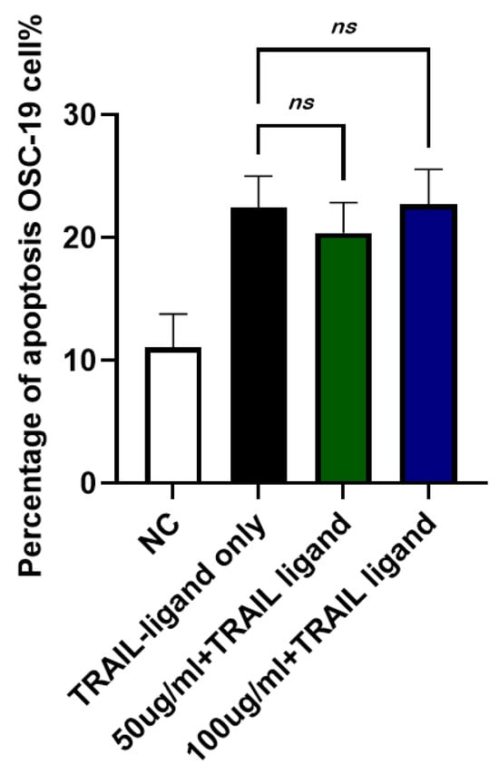 Figure 9. Effect of JTT on TRAIL-induced apoptosis in OSC-19 cancer cells. OSC-19 cells were cultured in DMEM and treated with TRAIL ligand to induce extrinsic apoptosis. JTT was administered at 50 µg/mL or 100 µg/mL and cells were incubated for 48 h. Apoptosis was evaluated by flow cytometry after 24 h of TRAIL exposure. Data represents the mean apoptotic cell percentage from three independent experiments. No significant reduction in apoptosis was observed in the JTT-treated groups, indicating that JTT does not inhibit apoptosis in this cancer cell line.