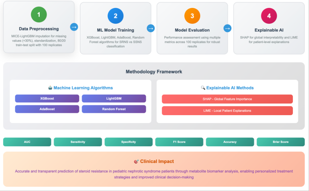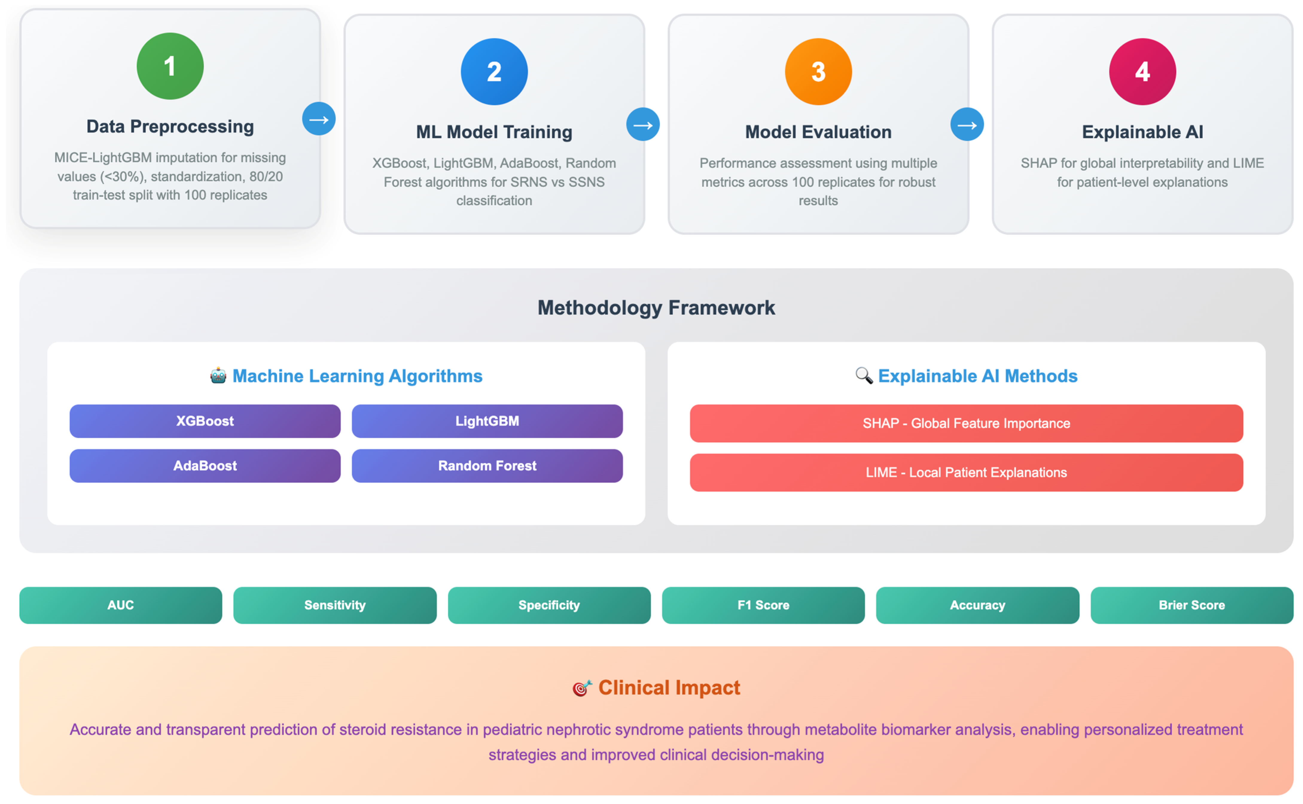 Despite the theoretical promise of integrating metabolomics with ML and XAI for predicting SRNS, this approach has not been systematically investigated in pediatric populations. The current study addresses this critical research gap by developing and validating a comprehensive ML-integrated XAI framework for predicting steroid resistance in pediatric NS using pre-treatment plasma metabolomic profiles. The current study selected four ensemble machine learning algorithms for their effectiveness with high-dimensional metabolomic data: (1) Random Forest (RF), an ensemble method robust to overfitting; (2) Extreme Gradient Boosting (XGBoost), a framework known for superior predictive performance; (3) Light Gradient Boosting Machine (LightGBM), an efficient implementation ideal for datasets with numerous features; and (4) Adaptive Boosting (AdaBoost), an iterative method that focuses on misclassified instances. These algorithms were chosen for their complementary strengths in handling challenges like multicollinearity and for their proven success in similar clinical prediction tasks [
