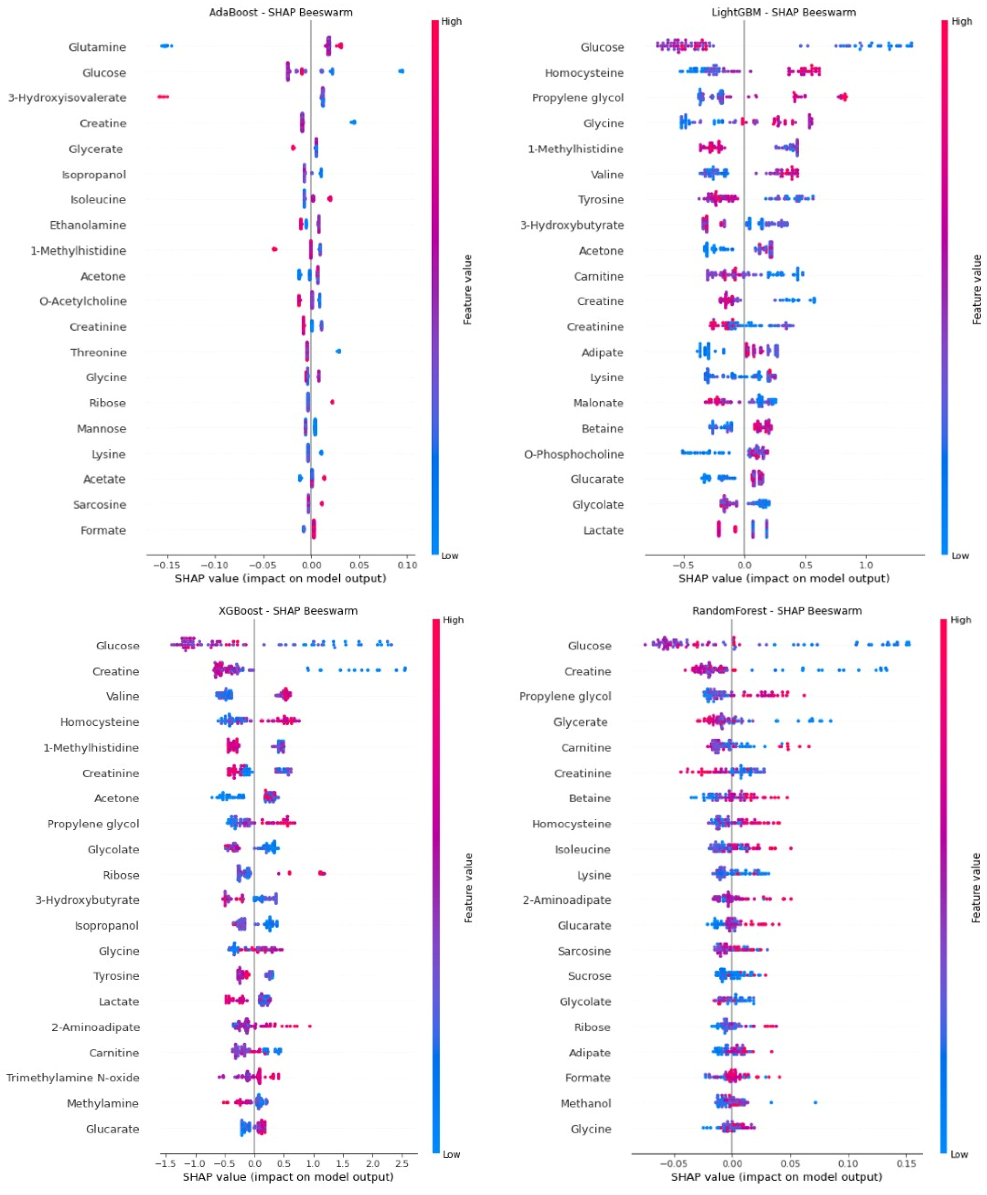 Figure 1 (SHAP summary plot) shows the global significance of metabolite biomarkers that were inputs to the four ML models used in predicting SRNS. Among the biomarkers appearing in the SHAP beeswarm plots of all models were glucose, creatine, 1-methylhistidine, homocysteine, and acetone, and these biomarkers were consistently identified as significant for SRNS by the ML models. SHAP analysis performed specifically for the RF model with the highest AUC performance further demonstrates the predictive power of these biomarkers. Glucose, the most dominant predictor in terms of both direction and magnitude of SHAP values, was observed to be positively associated with SRNS risk at low glucose levels. Similarly, creatine, glycerate, and creatinine levels exhibited a positive SHAP effect at low concentrations (thereby increasing the probability of SRNS), supporting early biochemical signs of SRNS. Therefore, increasing levels of these compounds to higher levels may have a protective effect or reduce the likelihood of SRNS. Conversely, higher propylene glycol and carnitine levels were observed to be associated with an increased risk of SRNS. These findings, based on SHAP values from the RF model, suggest that, in addition to compounds associated with glucose and creatine metabolism, amino acid derivatives and organic acids may also be considered important biomarkers for predicting SRNS.