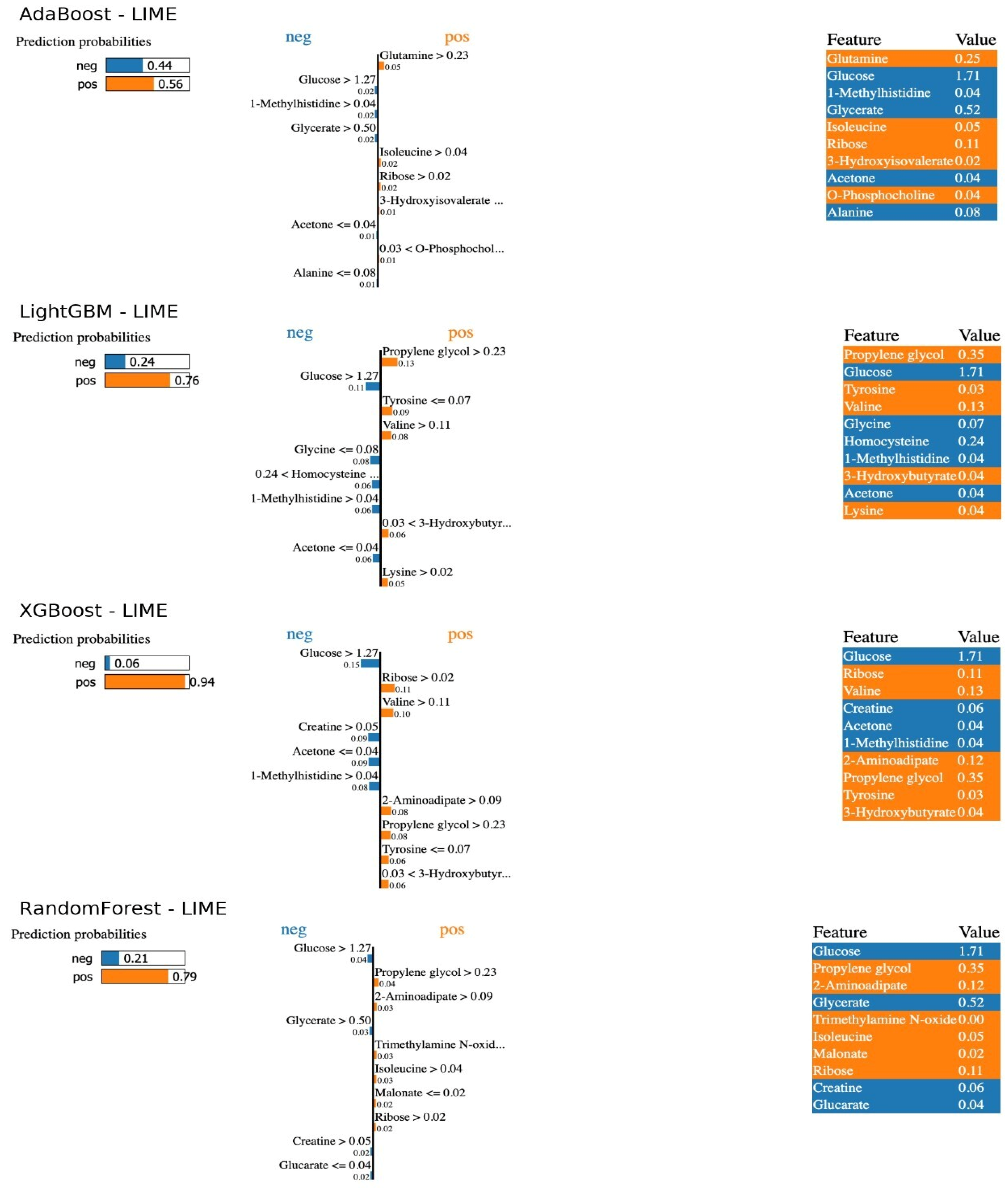 Figure 2 (LIME indicators for individual predictions) provides detailed information about the model decisions for a patient where each model made a positive correct prediction. Each different ML model predicted the patient with different probabilities of having SRNS. The LIME plots explain the conditional statements from which the model made its predictions. Examining the LIME results for the optimal RF model, the patient was classified as having SRNS with a 79% probability and SSNS with a 21% probability. Specifically, the patient’s glucose level being greater than 1.27, glycerol greater than 0.50, and creatinine greater than 0.05 explain the probability ratio resulting in the model classifying SSNS (probability of incorrect class prediction). Furthermore, the patient’s propylene glycol level being greater than 0.23 and 2-aminoadipate greater than 0.09 led the model to assign this patient to SRNS with a higher probability, resulting in a true positive prediction. Consequently, model predictions confirmed the trends obtained from SHAP, demonstrating the importance of low glucose and high propylene glycol levels. The LIME results showed that predictions for high-risk patients were consistently based on markers such as low glucose and high carnitine levels. This individual-level interpretability increases clinical confidence in ML models and supports the potential of these metabolites as early biomarkers (