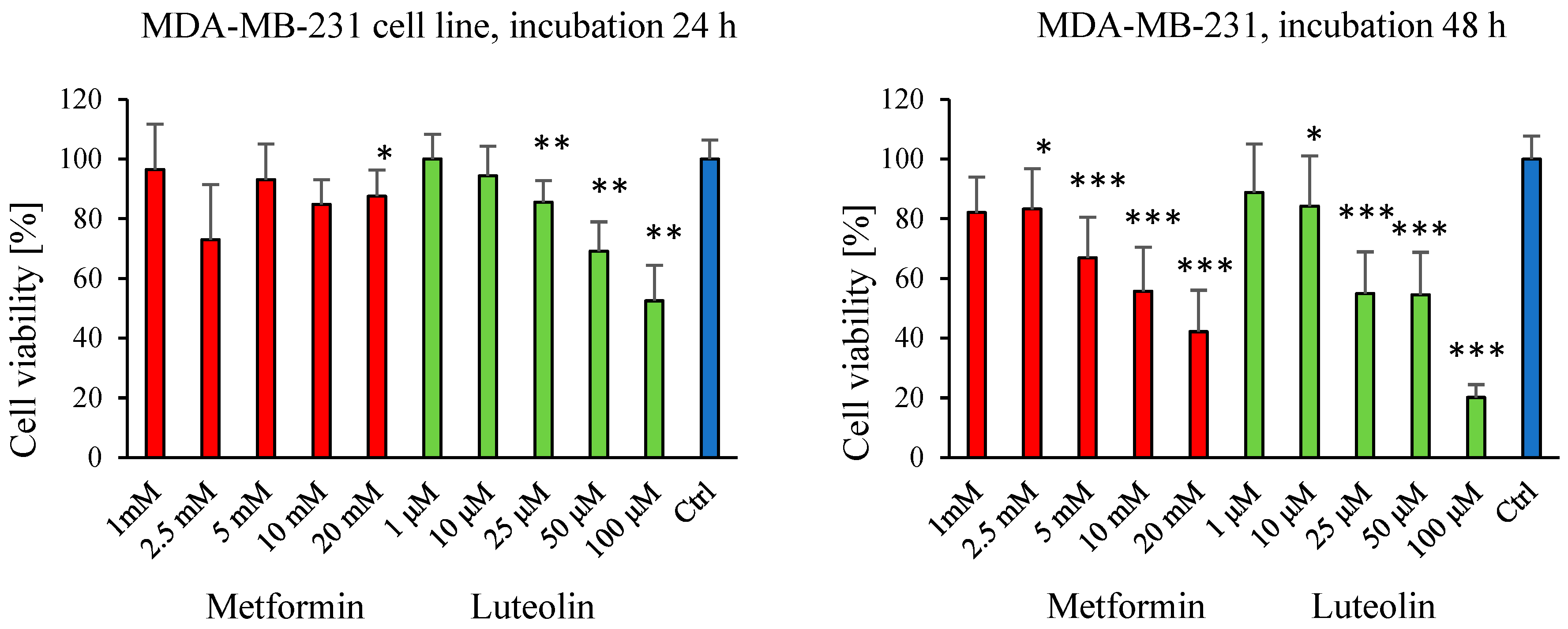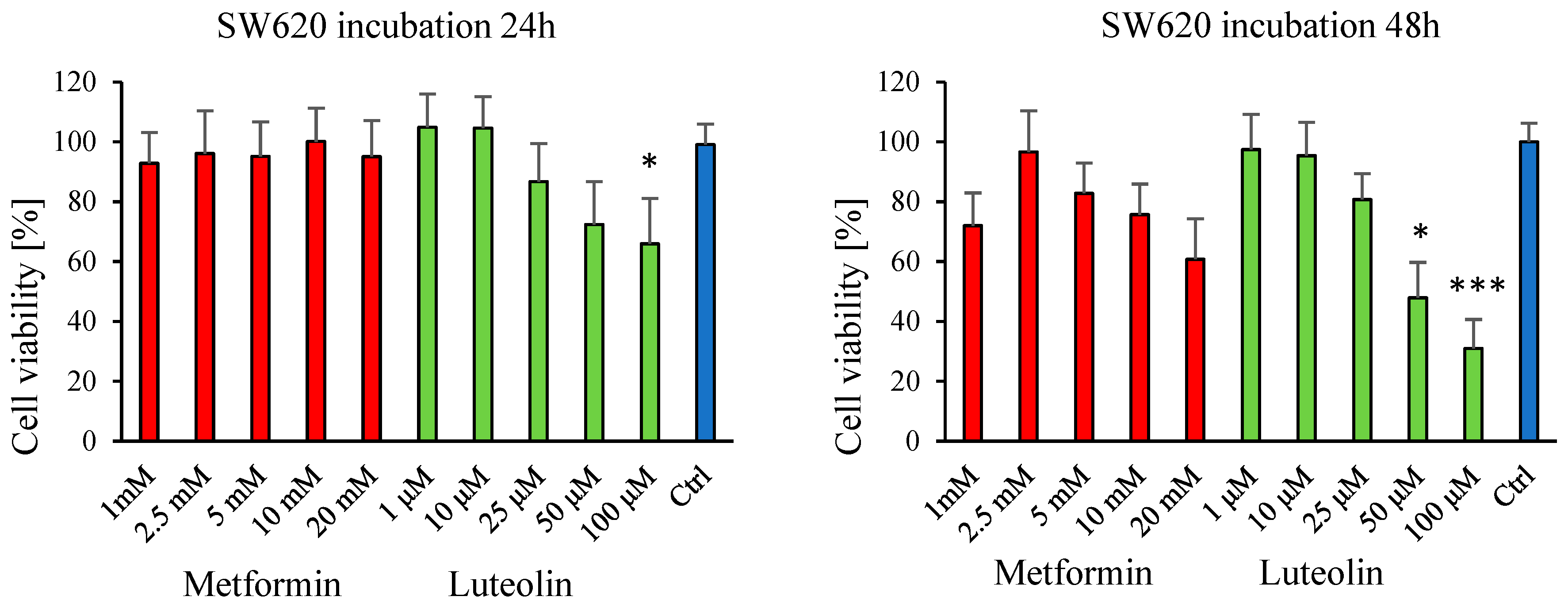 APA StyleGębczak, K., Cwynar-Zając, Ł., Sapeta-Nowińska, M., & Barg, E. (2025). Additive Anticancer and Antioxidant Effects of Metformin and Luteolin in Breast and Colorectal Cancer Cell Lines. Pharmaceuticals, 18(11), 1660. https://doi.org/10.3390/ph18111660