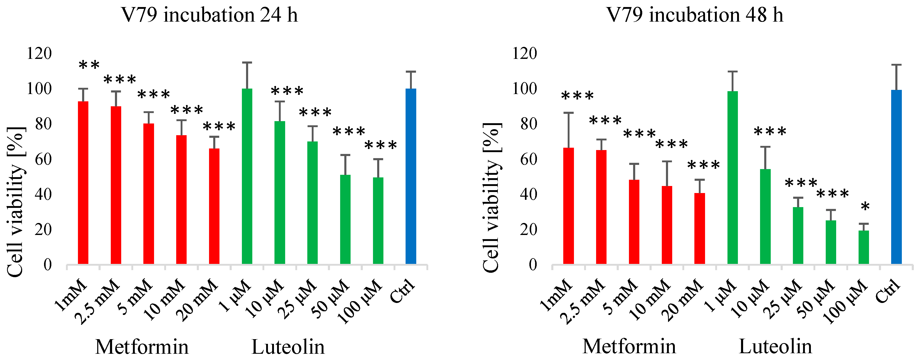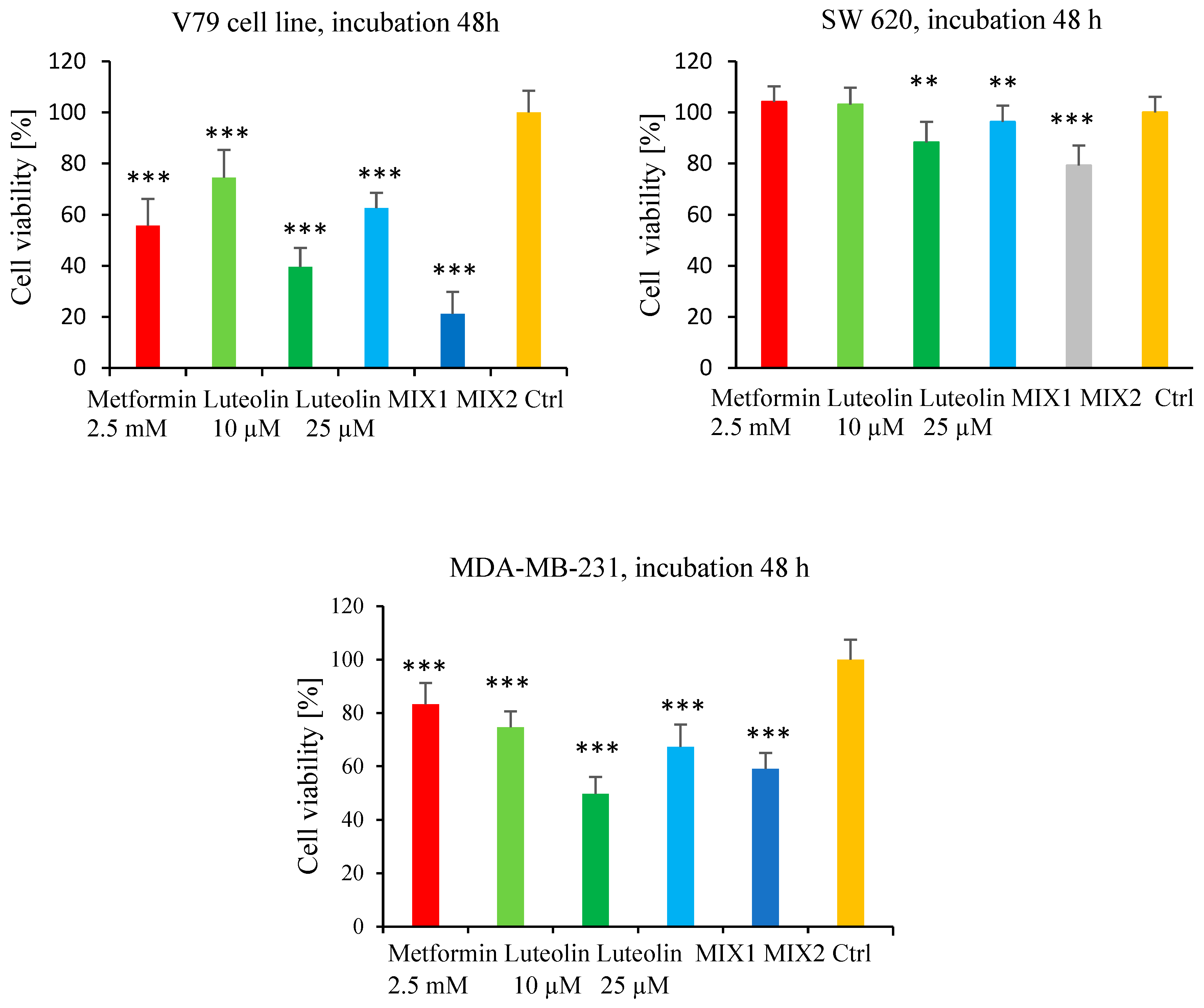 2.1. Effect of Luteolin and Metformin on Viability of SW620, MDA-MB-231, and V79 Cells