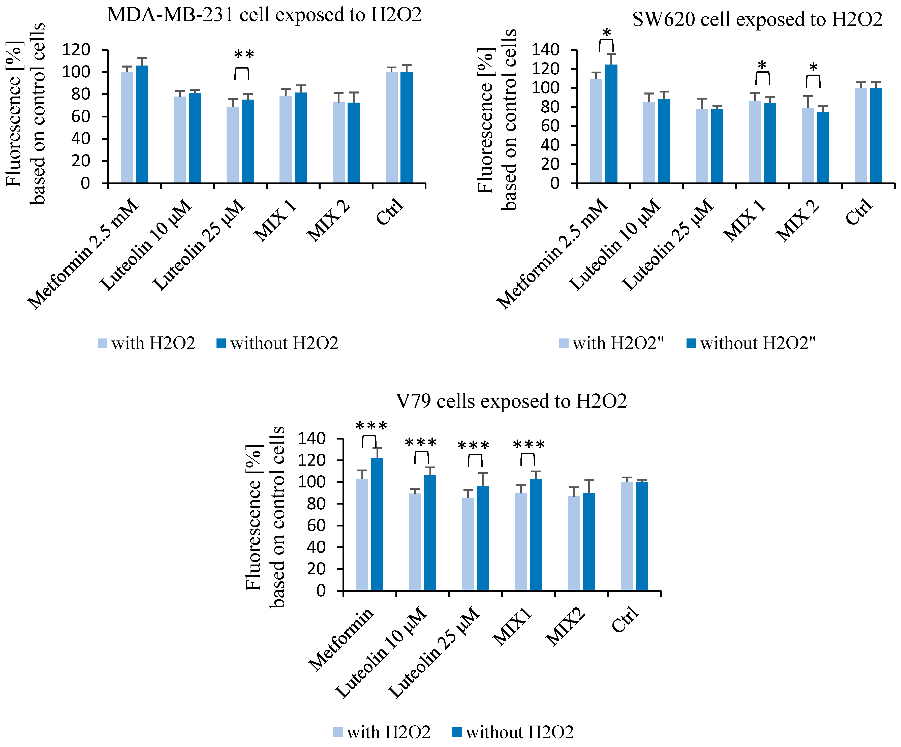 2.2. Effect of Luteolin and Metformin Under Oxidative Stress Conditions