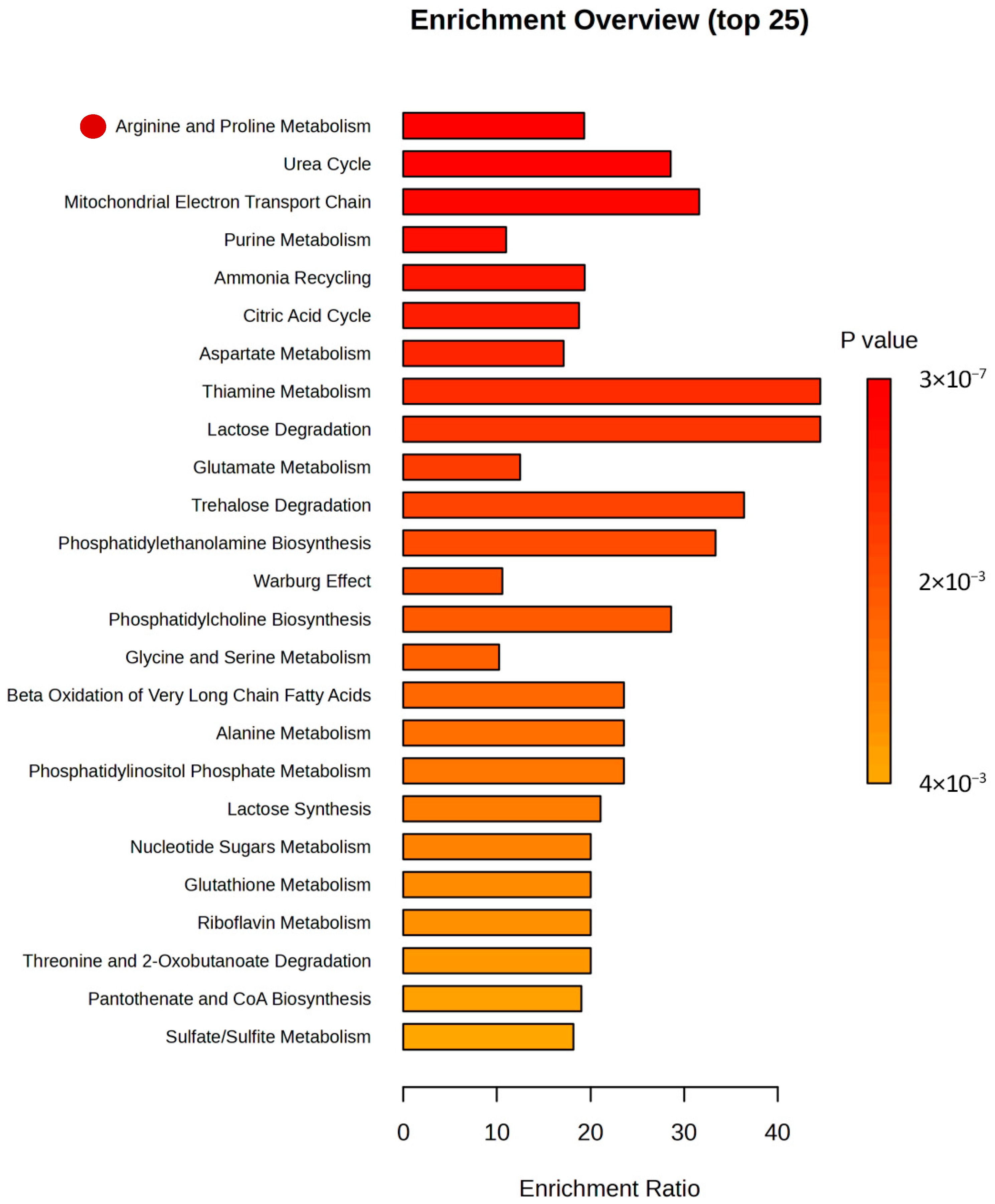 | Arginine and Proline Metabolism | 5 | 3.12 × 10−7 | 3.06 × 10−5 | 3.06 × 10−5 |