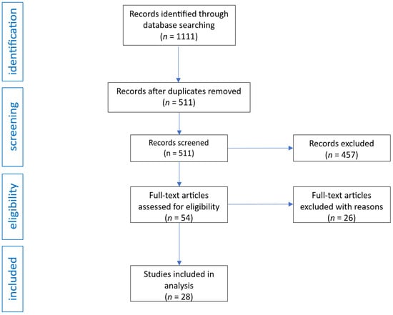 The initial search yielded 1111 records. After the removal of 600 duplicates, 511 unique publications remained. These were screened by title and abstract, resulting in the exclusion of 457 records that did not meet inclusion criteria. Fifty-four articles were selected for full-text review. Of these, 26 were excluded due to lack of relevant outcomes or insufficient relevance to the review topic. Ultimately, 28 studies met all eligibility criteria and were included in the final analysis. The selection process is presented in Figure 1.