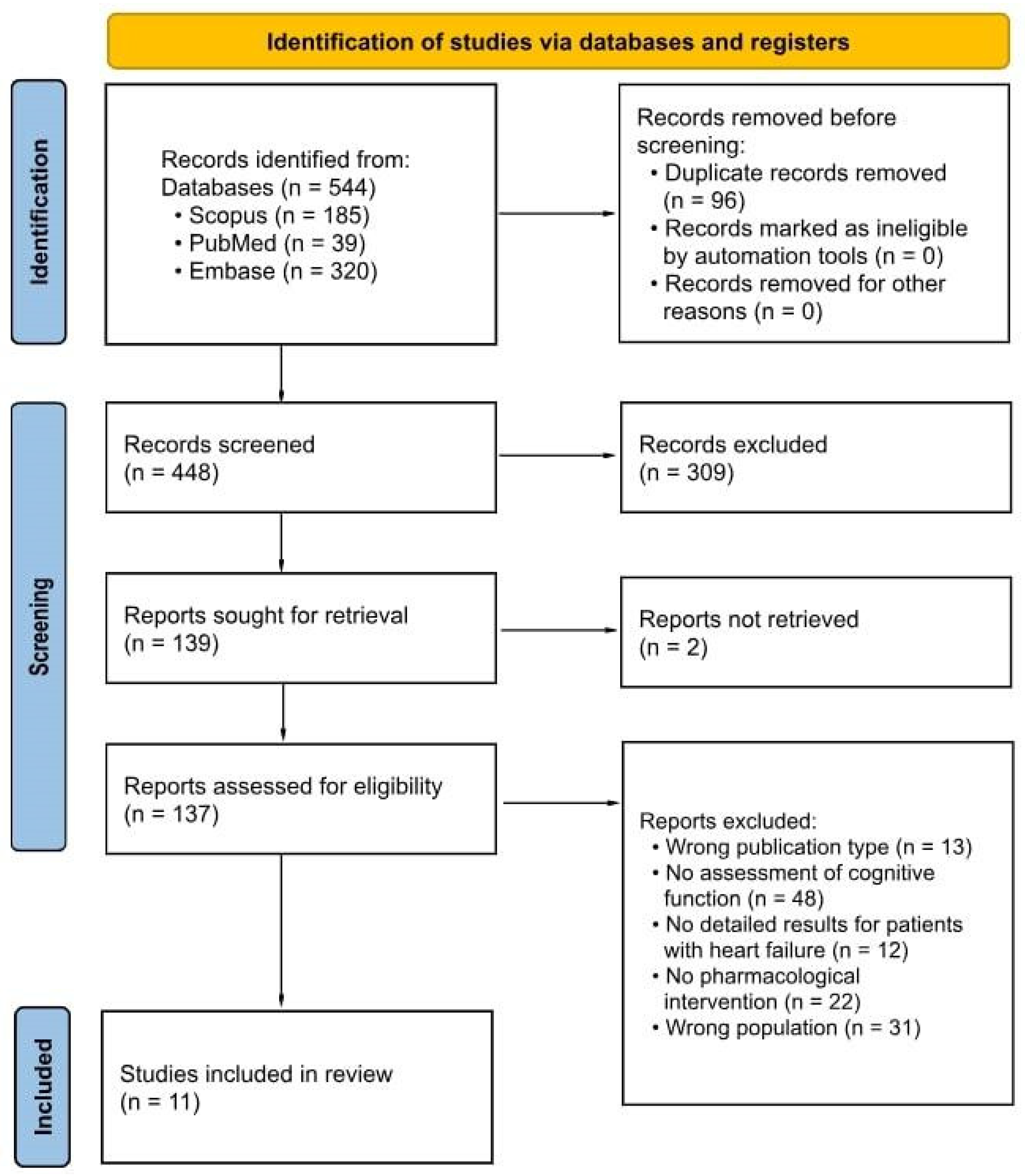 Balcerzak, W.; Poczatek, G.; Gorzkowska, A.; Blach, A.; Jurkiewicz, M.; Lasek-Bal, A. Cognitive Safety and Outcomes of Pharmacological Management in Heart Failure: A Systematic Review. Pharmaceuticals 2025, 18, 1671. https://doi.org/10.3390/ph18111671