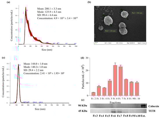 NTA (a), SEM images (b), size distribution of the most enriched fraction 6 analyzed through NTA (c), particle concentration of different density gradient fractions reported as Particles/mL obtained by NTA (d), TET8 and Calnexin detection in gradient fractions (from 3 to 10) and R. canina extract (Ext) obtained by immunoblotting (e). Data are expressed as mean ± SD (n = 3).