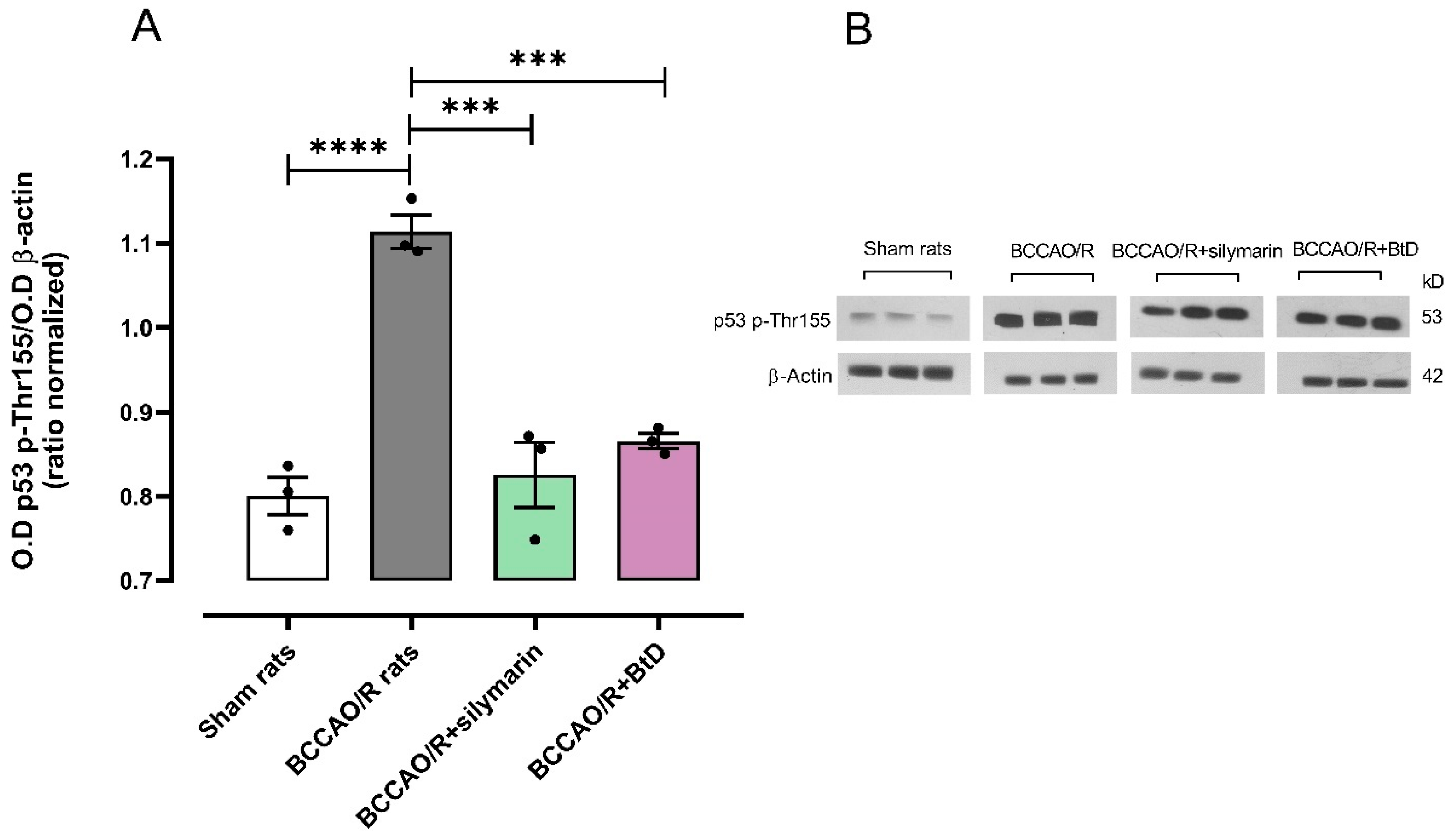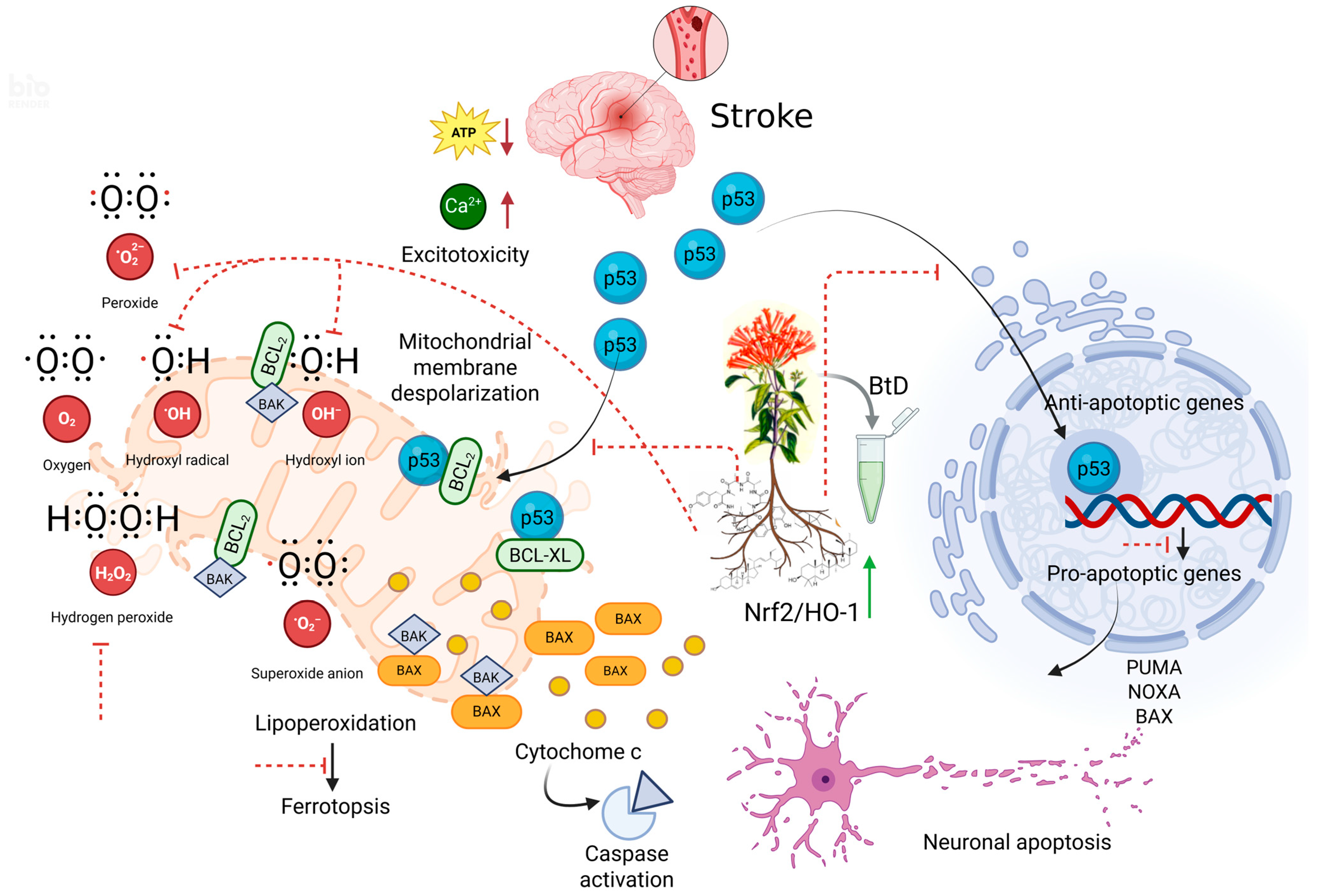 - Transcriptional Crosstalk with the Nrf2/HO-1 Pathway. Many natural antioxidants activate Nrf2, which suppresses oxidative and apoptotic pathways while indirectly modulating p53 [37]. BtD components like α-tocopherol, squalene, and rubiyunnanin H are potential Nrf2 activators. Upon activation, Nrf2 upregulates HO-1, NQO1, and GCLC, reducing ROS-induced p53 activation and apoptosis. Hence, BtD may modulate p53 transcriptionally via Nrf2-dependent antioxidant gene induction, maintaining neuronal viability during ischemia/reperfusion injury. Compounds present in BtD extract could inhibit p53 translocation to the outer mitochondrial membrane, where it directly binds to and inactivates the anti-apoptotic proteins B-cell lymphoma-2 (BCL-2) and extra-large B-cell lymphoma (BCL-xL). This results in oligomerization of B-cell lymphoma-2-associated X protein (BAX) and B-cell lymphoma-2 antagonist/killer (BAK). However, further experiments are required to determine the pathway of p53 inhibition [38].