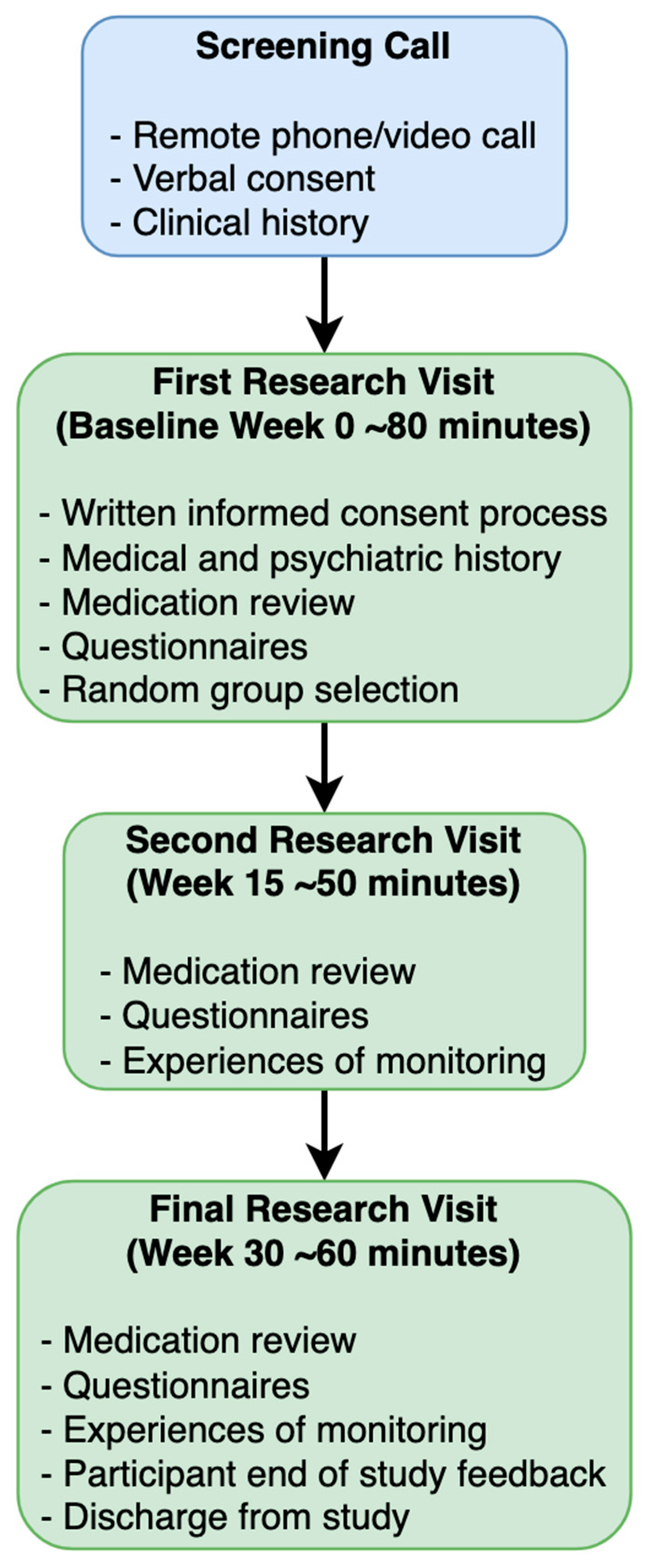 A study flowchart is shown in Figure 1. Participants will attend three visits: at week 0 (baseline), week 15, and week 30. All visits can take place remotely (i.e., via video call) or in person. Potential participants will first attend a screening visit to assess their eligibility and obtain verbal consent. Eligible participants will then be invited to attend a baseline visit, where written informed consent will be obtained, and demographic and baseline assessments will be administered (see Table 1). Following this, participants will be randomised, and the intervention will begin.