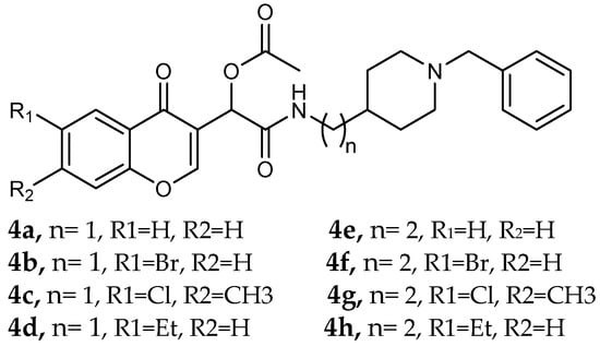 Simakov et al. [] investigated eight novel multi-target-directed ligands, compounds 4a through 4h, which combine chromone and donepezil moieties as potential AD treatments (Figure 2). The design of these MTDLs was based on a knowledge-based approach, employing a non-cleavable linked-pharmacophore strategy to connect the two pharmacophores with a linker.