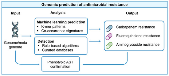 26]. The accuracy of predictions depends on the quality of the reference knowledge that links sequences to phenotypes. Genomic prediction of AMR is one of the most clinically impactful applications of sequencing, offering faster therapy guidance and resistance tracking. However, it is constrained by genotype–phenotype variability and the quality of reference databases.