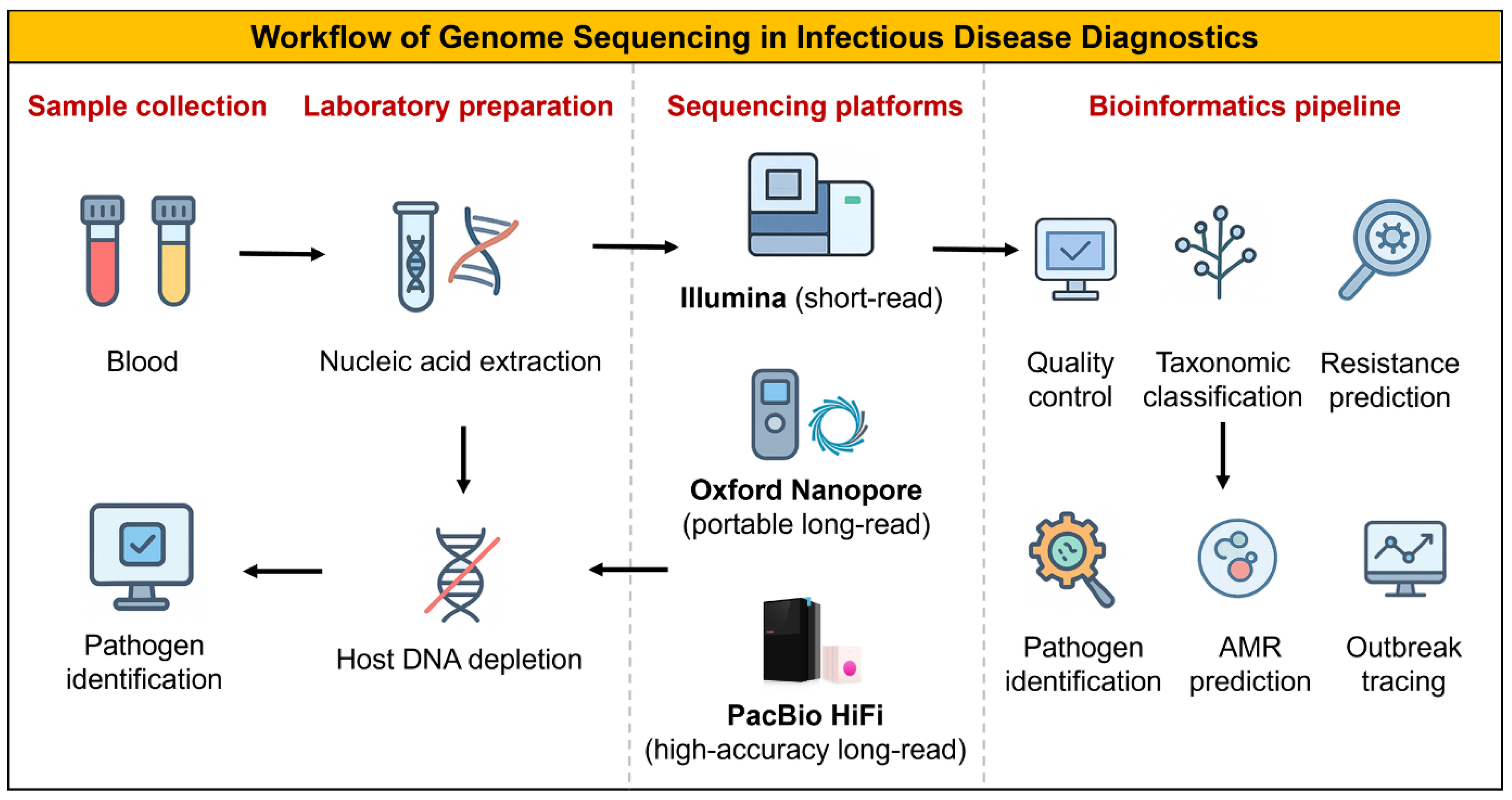 5]. Technical advances in short- and long-read platforms, together with culture-independent metagenomic sequencing, have revolutionized pathogen identification and resistance tracking across clinical and public health settings [