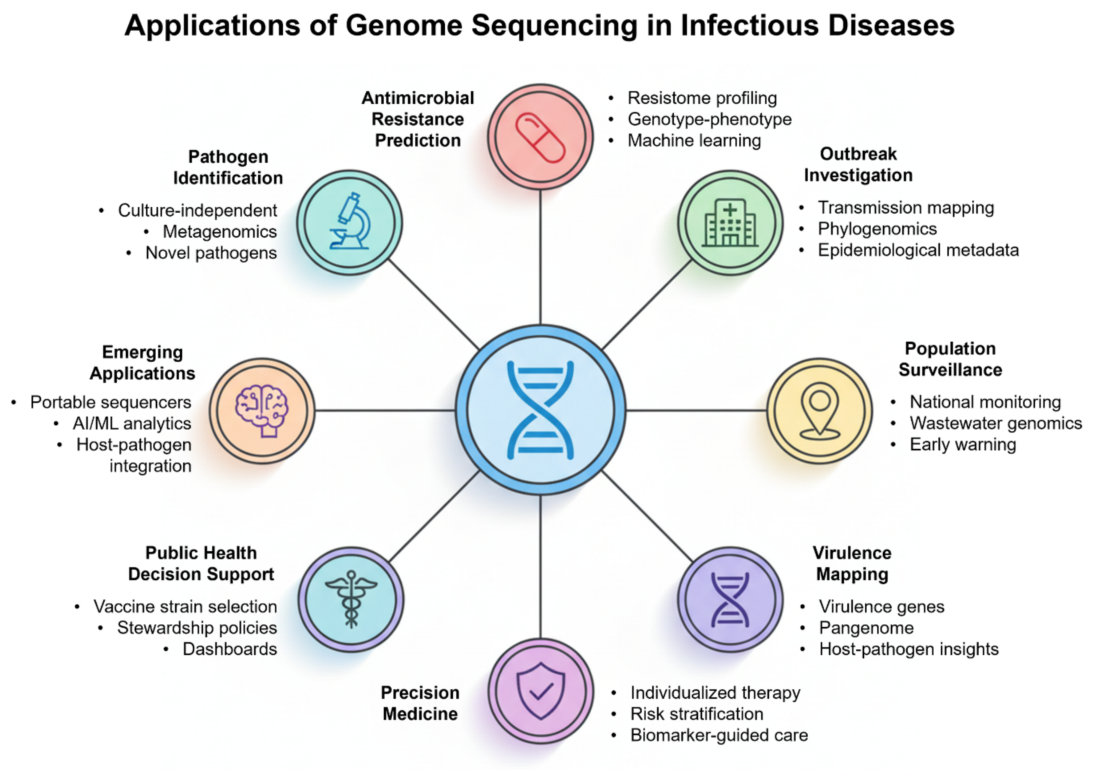 In addition to individual and outbreak diagnosis, sequencing enables continuous surveillance of pathogen evolution, resistance emergence, and geographic spread. These genomic surveillance programs, both national and regional, for influenza, SARS-CoV-2, foodborne pathogens, and priority AMR organisms, provide an evidence base for public health policy, e.g., vaccine strain selection, infection control guidance, and stewardship priorities [