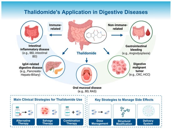 As mentioned above, thalidomide exerts multiple anti-inflammatory and immunomodulatory effects, which explains its increasing application in immune-related diseases in recent years. Among digestive system diseases, thalidomide is mainly used in intestinal inflammatory diseases, IgG4-related digestive diseases, and oral mucosal disorders.