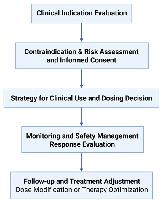 Figure 5. Clinical process of thalidomide administration. This flowchart outlines the stepwise approach to ensure rational and safe thalidomide use, from indication and risk assessment to therapeutic monitoring and evaluation.