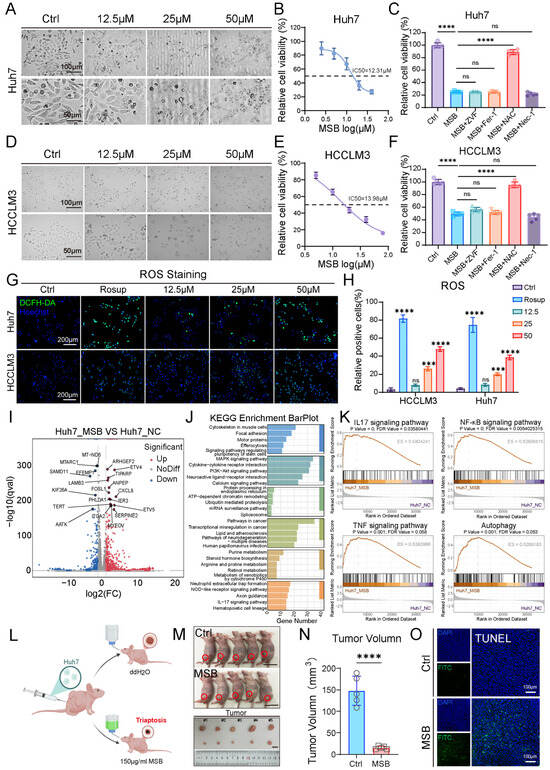 Triaptosis induction suppresses HCC progression through ROS-mediated cellular stress. (A,D) Morphological changes in Huh7 and HCCLM3 cells treated with escalating concentrations of MSB (0–50 μM) for 12 h, showing cytoplasmic vacuolization, membrane rupture, and dose-dependent cell death (scale bars: 100 μm, 50 μm). (B,E) Dose–response curves and half-maximal inhibitory concentrations (IC50: Huh7 = 12.31 μM; HCCLM3 = 13.98 μM). (C,F) Rescue of cell viability by co-treating with reactive oxygen species (ROS) scavenger N-acetyl-L-cysteine (NAC), but not other inhibitors: Z-VAD-FMK (ZVF, pan-caspase inhibitor), ferrostatin-1 (Fer-1, ferroptosis inhibitor), or necrostatin-1 (Nec-1, necroptosis inhibitor). (G) Intracellular ROS accumulation (green fluorescence) proportional to MSB concentration (scale bars: 200 μm; blue fluorescence: Hoechst). (H) Quantitative analysis of ROS levels by DCFH-DA fluorescence intensity. (I) Volcano plot of transcriptomic profiling in MSB-treated Huh7 cells (1159 upregulated [red] genes; 382 downregulated [blue] genes; |log2FC| > 1, p < 0.05). (J) KEGG pathway enrichment of upregulated genes highlighting inflammatory and autophagy pathways. (K) GSEA showing activation of IL-17, NF-κB, TNF signaling, and autophagy-associated cell death. (L) Schematic of subcutaneous xenograft model with Huh7 cells. (M) Representative images of tumors from control and MSB-treated mice. (N) Significant tumor volume reduction in MSB-treated mice vs. controls (**** p < 0.0001). (O) TUNEL staining confirming triaptosis-associated cell death in MSB-treated tumors (scale bars: 50 μm). Data: mean ± SD; statistics: Student’s t-test (two-group) or one-way ANOVA (multi-group); *** p < 0.001, **** p < 0.0001; ns: not significant.