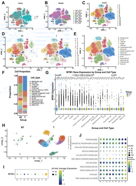 Single-cell transcriptomic landscape reveals MTM1 dysregulation in HCC. (A) t-SNE visualization of 58,845 high-quality single cells profiled from paired HCC tumors (n = 5) and matched normal liver tissues (n = 5) using 10X Genomics scRNA-seq (GSE242889). (B) Batch-corrected t-SNE projection stratified by patient origin, demonstrating minimal technical batch effects. (C) Unsupervised clustering analysis resolving 17 transcriptionally distinct cellular subgroups across the integrated dataset. (D) Subgroup distribution between HCC and matched normal tissues. (E) t-SNE plots annotated by cell types in combined cohorts. (F) Proportional composition of 15 cell types in HCC versus normal tissues. (G) Differential expression of the triaptosis-related gene MTM1 across 15 cell types (tumor vs. normal). (H) High-resolution clustering of malignant hepatocytes identifies nine molecularly distinct neoplastic subpopulations. (I) Heterogeneous MTM1 expression patterns across malignant hepatocyte subclusters. (J) Pathway activation heatmap reveals cluster 8-specific enrichment of oncogenic signaling networks (PI3K-AKT-mTOR, TNFα-NF-κB, p53, and KRAS pathways).
