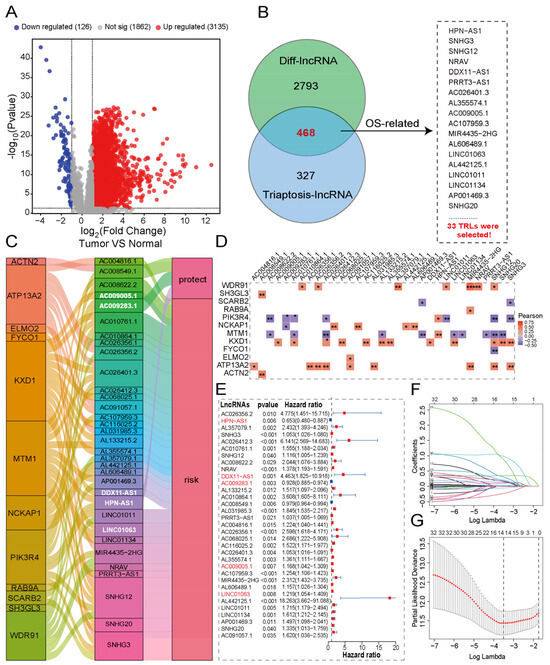 Initial analysis included 374 HCC patients from TCGA, from which we identified twelve triaptosis-related genes (TRGs) based on prior reports [9]. The study design flowchart is presented in the Graphical Abstract. To evaluate clinical significance, we performed comparative transcriptomic profiling between HCC tissues and matched adjacent normal tissues. Using stringent criteria (|log2FC| > 1, p < 0.001), we identified 3261 differentially expressed lncRNAs (DELs), with detailed annotations provided in Supplementary Table S2. The global expression landscape of lncRNAs in HCC versus normal tissues is depicted in Figure 3A through a volcano plot. The association between TRGs and lncRNAs was investigated by Pearson correlation analysis using stringent thresholds (|R| > 0.3, p < 0.001). This analysis identified 795 significantly correlated lncRNAs, as shown in Supplementary Table S3. Through integration of TRG-correlated lncRNAs (TCLs) and DELs, we established a novel category of 468 transcripts designated as Triaptosis-Correlated Differentially Expressed lncRNAs (TCDELs) (Figure 3B). Subsequent univariate Cox regression analysis of overall survival (OS) data from TCGA revealed 33 TCDELs with significant prognostic value (Figure 3B,E; Supplementary Table S4).