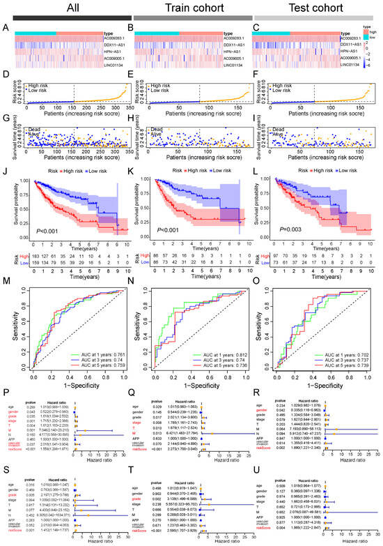 Validation of the triaptosis-related lncRNA (TRL) prognostic model in HCC cohorts. (A–C) Risk score distributions in the (A) entire cohort, (B) training cohort, and (C) validation cohort. (D–F) Median risk scores across cohorts. (G–I) Survival status, survival time, and risk score alignment in each cohort. (J–L) Kaplan–Meier survival curves for high- versus low-risk subgroups (overall, training, and validation cohorts). (M–O) Time-dependent receiver operating characteristic (ROC) curves evaluating 1-, 3-, and 5-year overall survival (OS) prediction (AUC values shown). Data presented as mean ± SD; log-rank test for survival analysis. (P–R) The univariate Cox regression analyses of overall, training, and validation cohorts. (S–U) The multivariate Cox regression analyses of overall, training, and validation cohorts.