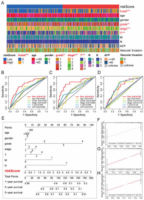 Clinical relevance and prognostic nomogram integrating the TRL signature in HCC. (A) Heatmap of clinicopathological features (red: significant differences, p < 0.05) stratified by TRL risk subgroups. (B–D) ROC curves comparing TRL signature performance against conventional prognostic markers in the entire (B), training (C), and validation (D) cohorts. (E) Multivariable nomogram combining TRL risk scores with clinical variables (age, sex, grade, TNM stage, vascular invasion) for OS prediction. (F–H) Calibration plots for 1-, 3-, and 5-year OS probabilities (observed vs. nomogram-predicted). Statistical significance: ** p < 0.01, *** p < 0.001; AUC, area under the curve.