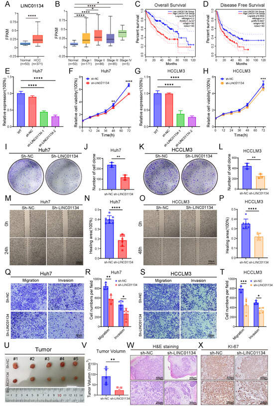 Clinical and functional characterization of LINC01134 in HCC. (A) Analysis of TCGA-LIHC data reveals significant upregulation of LINC01134 in HCC tissues compared to normal liver tissues. (B) LINC01134 expression increases with tumor progression (AJCC staging). (C,D) Kaplan–Meier survival analysis demonstrates that high LINC01134 expression correlates with worse OS (log-rank test, p < 0.0001) and DFS (log-rank test, p = 0.0038). (E,G) Efficient LINC01134 knockdown in Huh7 and HCCLM3 cells using shRNA-1 and shRNA-2 (p < 0.0001 vs. NC). (F,H) CCK-8 assays demonstrate significantly reduced proliferation in LINC01134-silenced cells over 72 h. (I,K) Representative images of colony formation assays showing decreased clonogenicity in LINC01134-silenced cells. (J,L) Quantitative analysis of cell colony numbers in colony formation assays. (M,O) Wound healing assays of Huh7 and HCCLM3 cells at 0, 24, and 48 h. (N,P) Quantitative analysis of wound closure rates. (Q,S) Transwell migration and invasion assays of Huh7 and HCCLM3 cells. (R,T) Quantification of migrated and invaded cells. (U) Representative photographs of subcutaneous tumors from NC and sh-LINC01134 groups on day 14. (V) Quantification of tumor growth volumes. (W) H&E staining reveals disrupted tumor architecture and increased fibrosis in sh-LINC01134 xenografts. (X) Decreased Ki-67-positive cells in sh-LINC01134 tumors by IHC. Data are presented as mean ± SD. Statistical significance was determined by Student’s t-test or one-way ANOVA: * p < 0.05, ** p < 0.01, *** p < 0.001, **** p < 0.0001.