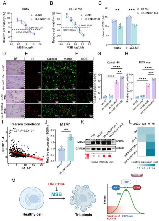 Functional and mechanistic insights into LINC01134-mediated triaptosis regulation in HCC. (A,B) Dose–response curves of Huh7 and HCCLM3 cells treated with MSB, showing reduced IC50 values in LINC01134-knockdown (sh-LINC01134) versus control (sh-NC) cells. (C) Statistical validation of triaptosis sensitivity across three biological replicates (Student’s t-test). (D) Bright-field microscopy images revealing accelerated cytoplasmic vacuolization and membrane rupture in sh-LINC01134 cell post-MSB treatment (scale bar: 50 μm). (E,G) Calcein-AM/PI dual staining quantifying PI-positive (dead) cells in sh-LINC01134 and sh-NC Huh7 cells (scale bar: 100 μm). (F,H) DCFH-DA staining demonstrating elevated ROS levels in sh-LINC01134 Huh7 cells (scale bar: 200 μm). (I) Scatter plot showing negative correlation between LINC01134 and MTM1 mRNA expression in HCC cohorts (Pearson’s R = −0.37, p < 0.0001). (J–L) qRT-PCR and Western blot analyses of MTM1 mRNA and protein levels in sh-LINC01134 Huh7 cells (normalized to GAPDH). (M) Schematic model: LINC01134 sustains PI(3)P pools by suppressing MTM1-mediated dephosphorylation, thereby desensitizing HCC cells to triaptosis. Data are presented as mean ± SD. Statistical significance was determined by Student’s t-test: ** p < 0.01, *** p < 0.001, **** p < 0.0001.