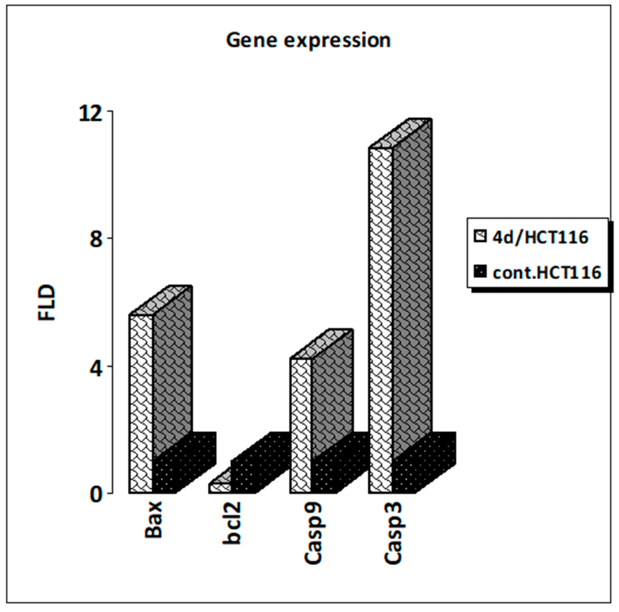 3.5. Effects of Compound 4d on Gene Expression Levels of Caspase-3, Caspase-9, Bax, and Bcl-2 Activation