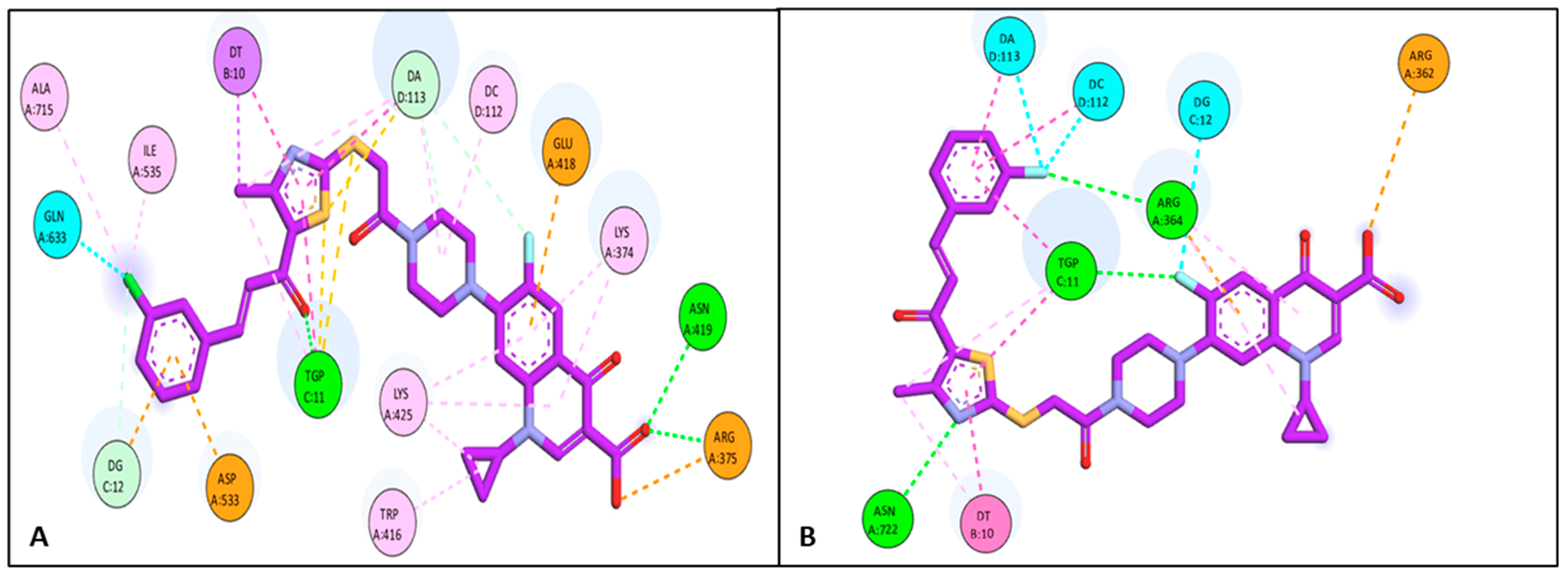 - Adly, M.E.; Taher, A.T.; Ahmed, F.M.; Mahmoud, A.M.; Salem, M.A.; El-Masry, R.M. New series of fluoroquinolone derivatives as potential anticancer Agents: Design, Synthesis, in vitro biological Evaluation, and Topoisomerase II Inhibition. Bioorganic Chem. 2025, 156, 108163. [Google Scholar] [CrossRef]