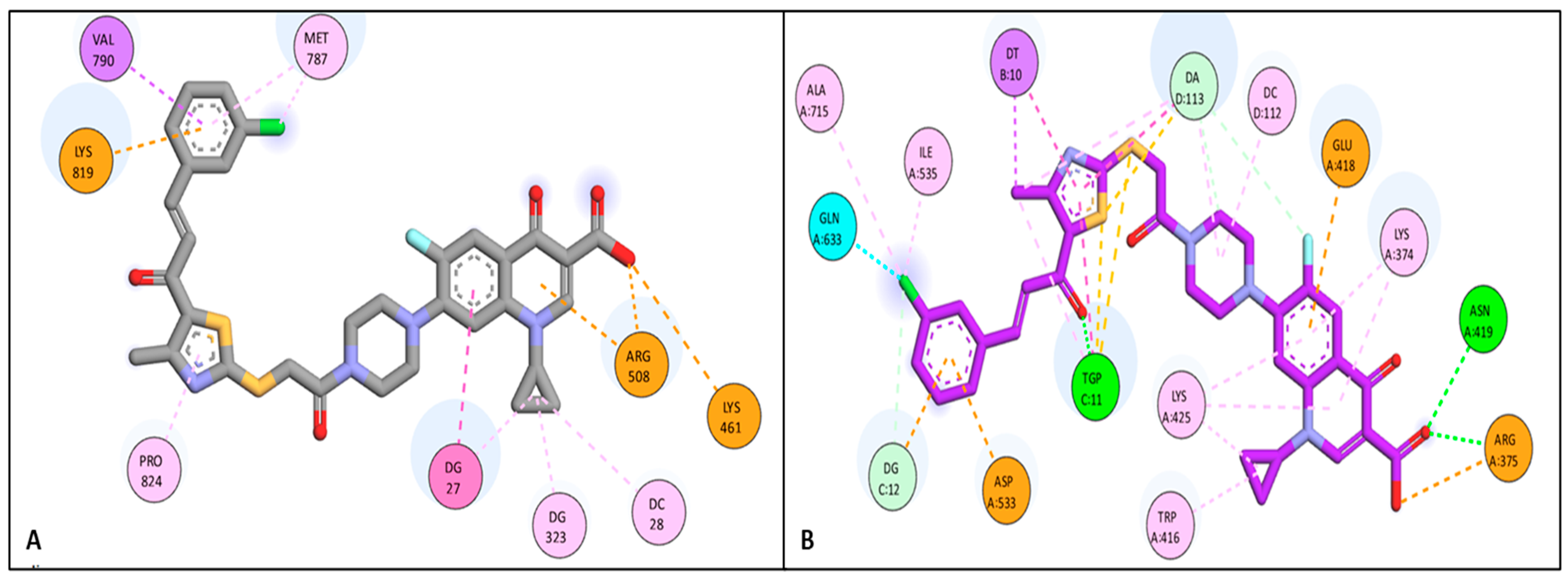 - Ali, D.M.E.; Aziz, H.A.; Bräse, S.; Al Bahir, A.; Alkhammash, A.; Abuo-Rahma, G.E.-D.A.; Elshamsy, A.M.; Hashem, H.; Abdelmagid, W.M. Unveiling the anticancer potential of a new ciprofloxacin-chalcone hybrid as an inhibitor of topoisomerases i & ii and apoptotic inducer. Molecules 2024, 29, 5382. [Google Scholar] [CrossRef]