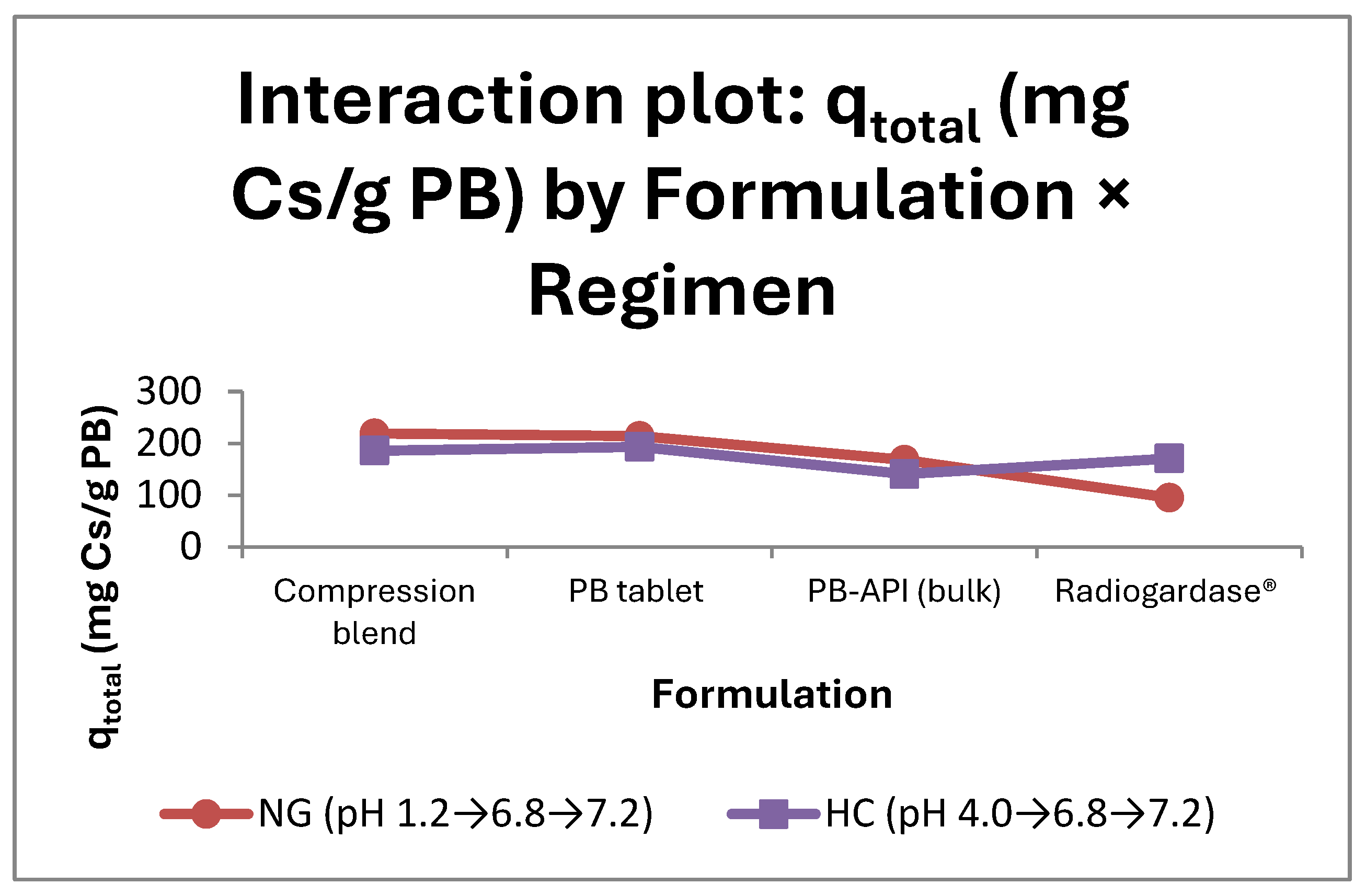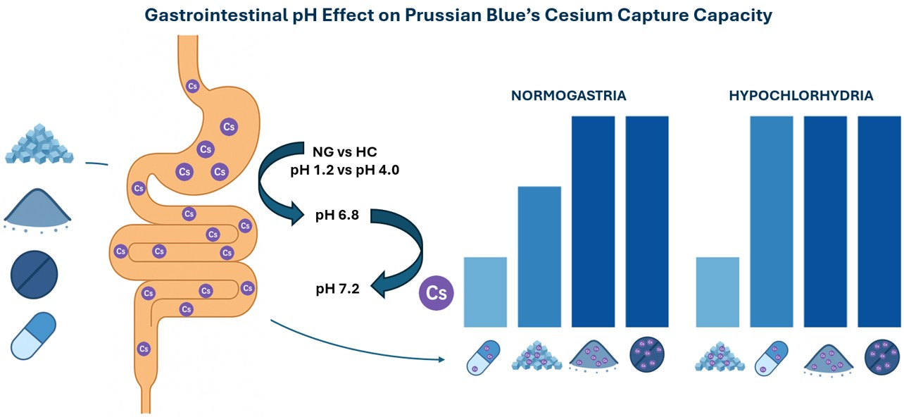 - Practical implication: under acidic gastric conditions (NG), PB tablets and Compression blend show robust performance, whereas Radiogardase® exhibits lower total capacity. Under less acidic conditions (HC), Radiogardase® improves and approaches the PB tablets and Compression blend (without surpassing them in NG) [10,15].