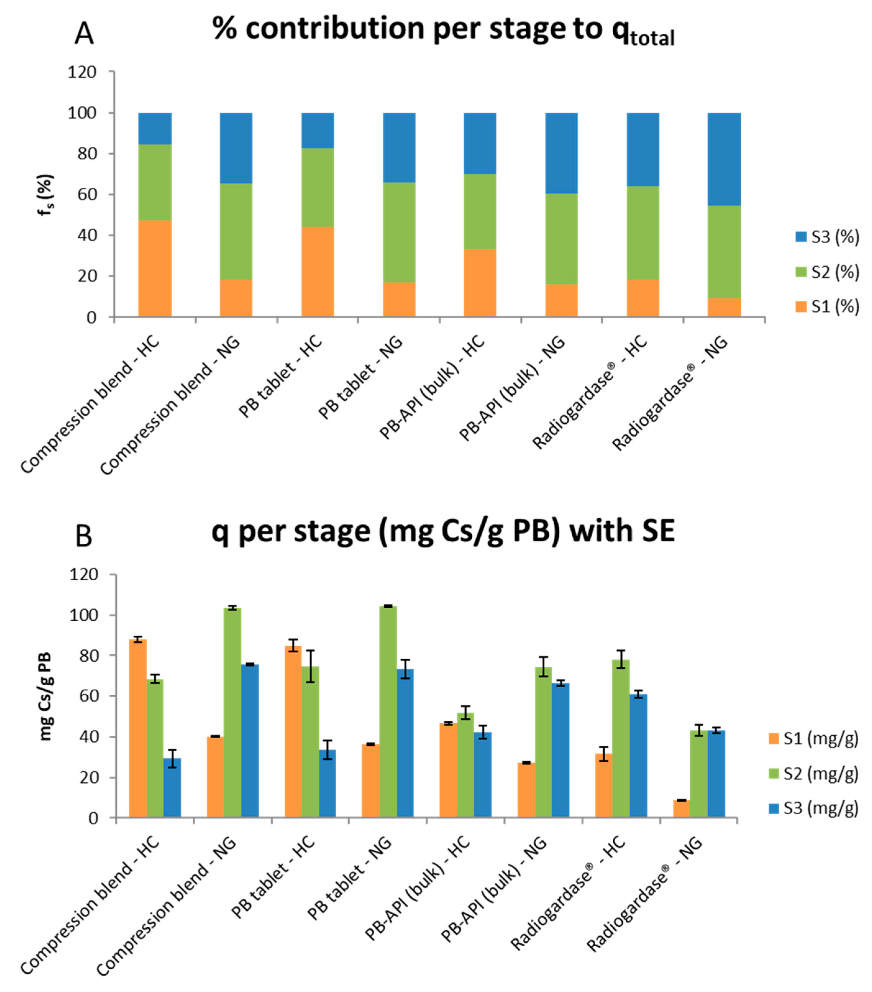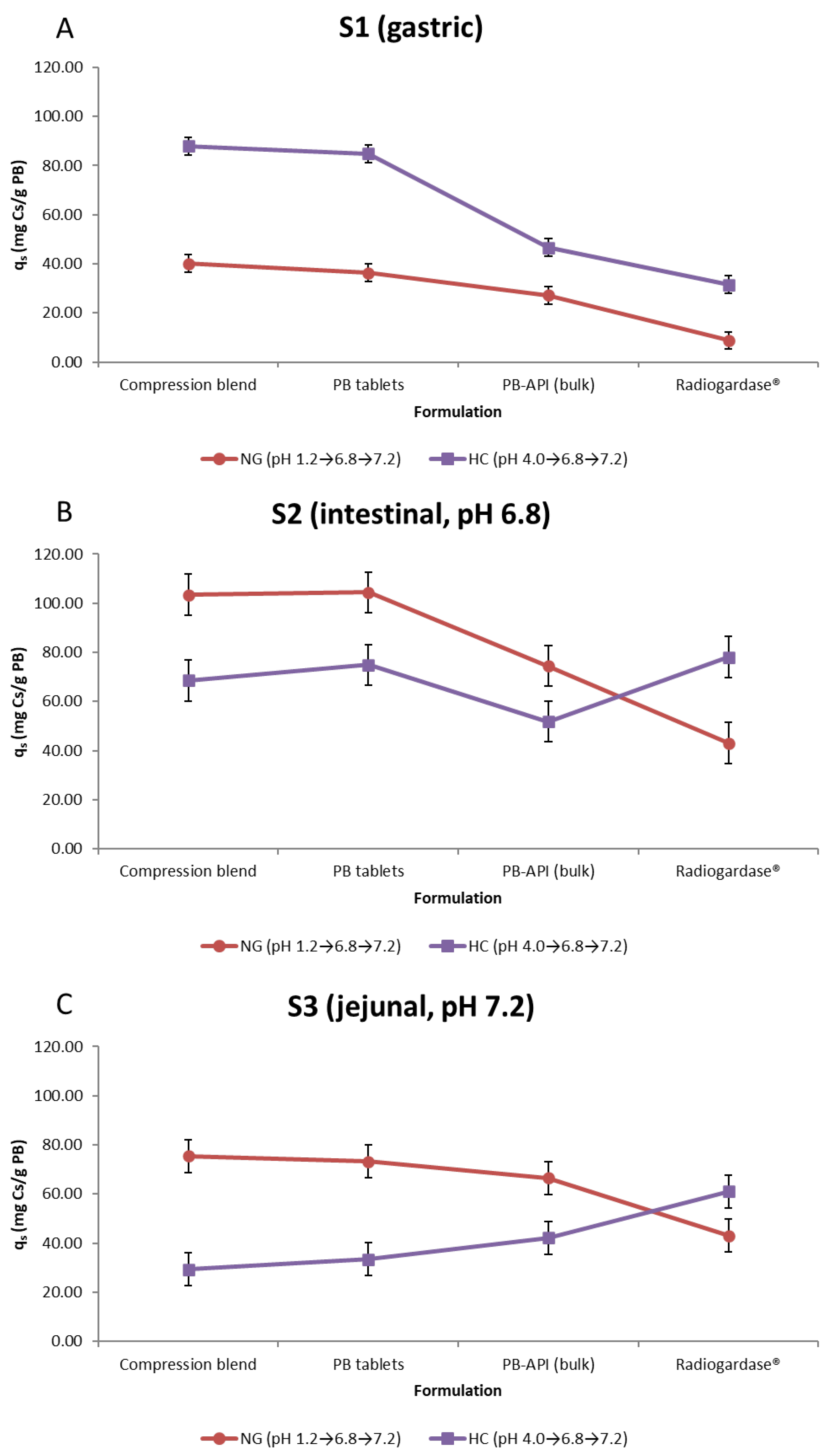 - Radiogardase® loses across all stages under NG, with the largest penalty in S2 (−35 mg/g). The % captured in S1 differs less between regimens, leaving S2 similar in % terms and providing no compensation in S3; consequently, qtotal declines. From a pharmaceutical standpoint, the compressed formulations (PB tablets and Compression blend) incorporate a microcrystalline-cellulose matrix that promotes rapid disintegration/dispersion and increases the effective surface of PB; preparation steps (e.g., sieving, compression) may also narrow the particle-size distribution. Radiogardase® was tested using the capsule content at equal PB mass, but its API is not synthesized at UAH (unlike the PB used for the developed formulations); therefore, intrinsic API differences may contribute to its distinct regimen-dependent profile (HC ≥ NG) and to lower absolute qs at later stages, despite identical S2/S3 pH and the normalization per gram of PB.