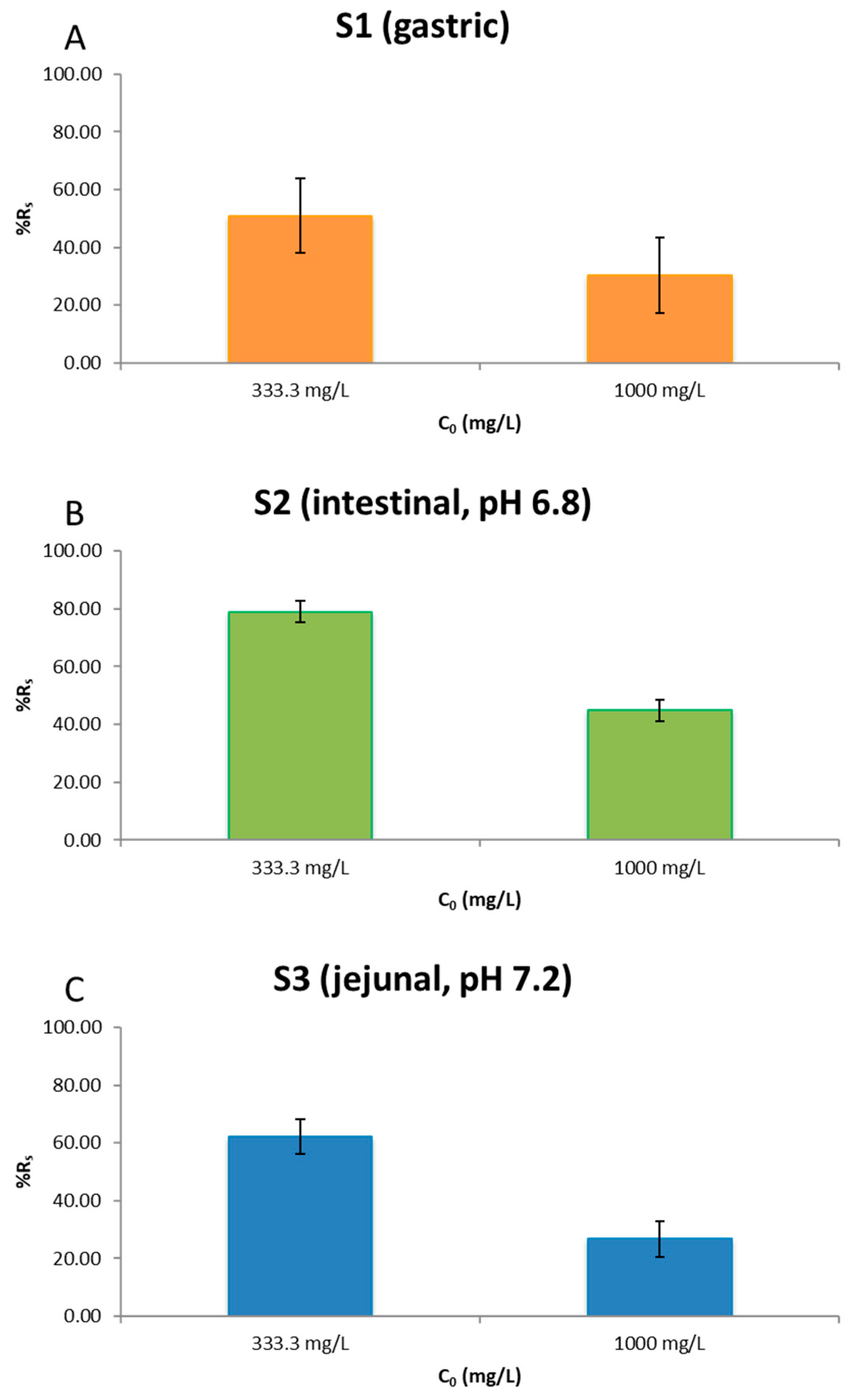 - S2 (pH 6.8): means 79.03% (333.3) vs. 44.81% (1000), one-way ANOVA significant, p < 0.001. Tukey significant (Δ = 34.22 ± 11.27).