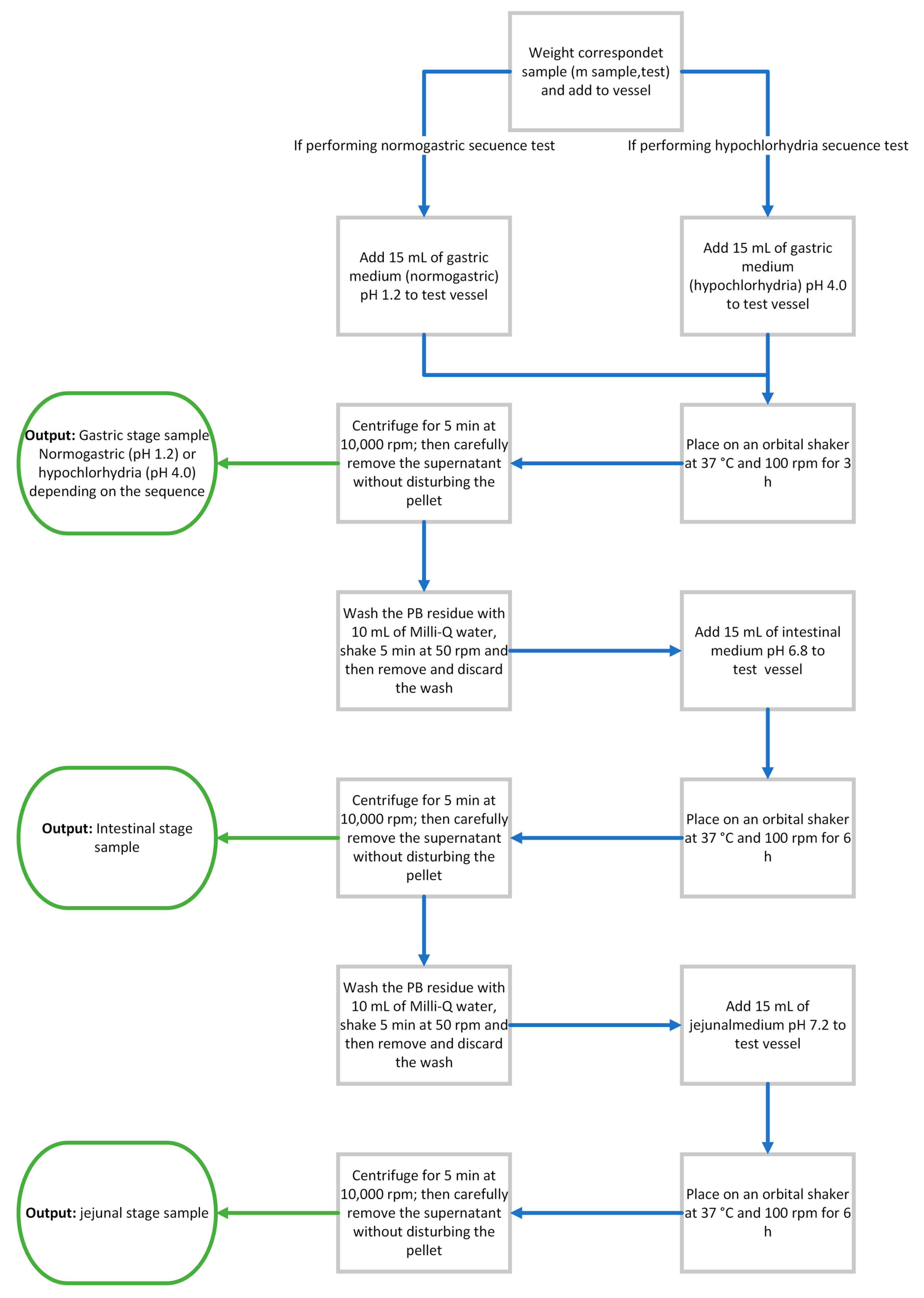- Jejunal stage (S3) (pH 7.2, 6 h). The PB residue was then contacted with 15 mL of pH 7.2 medium, shaken at 100 rpm and 37 °C for 6 h, centrifuged for 5 min at 10,000 rpm, and the supernatant was collected (jejunal stage sample).
