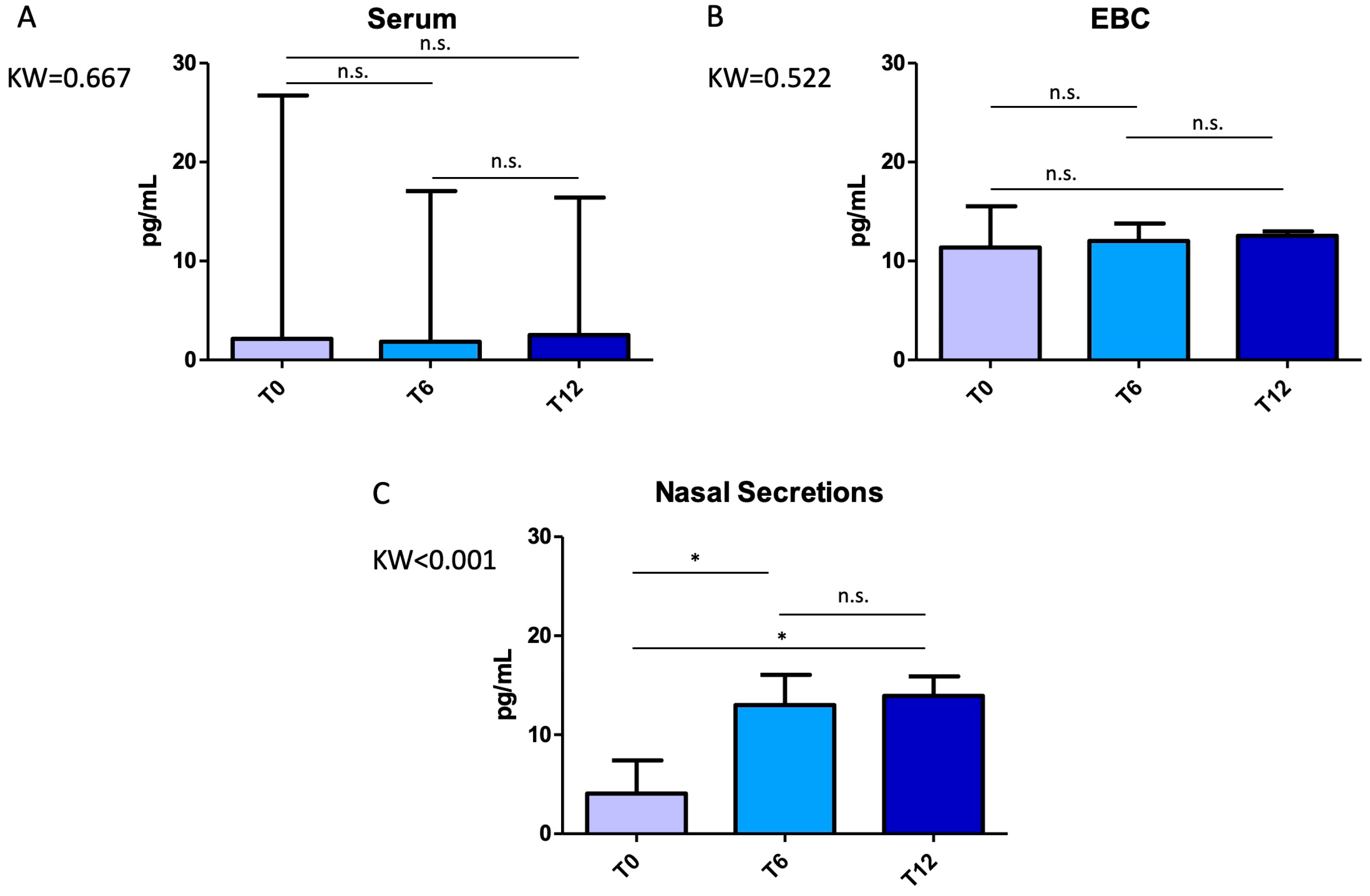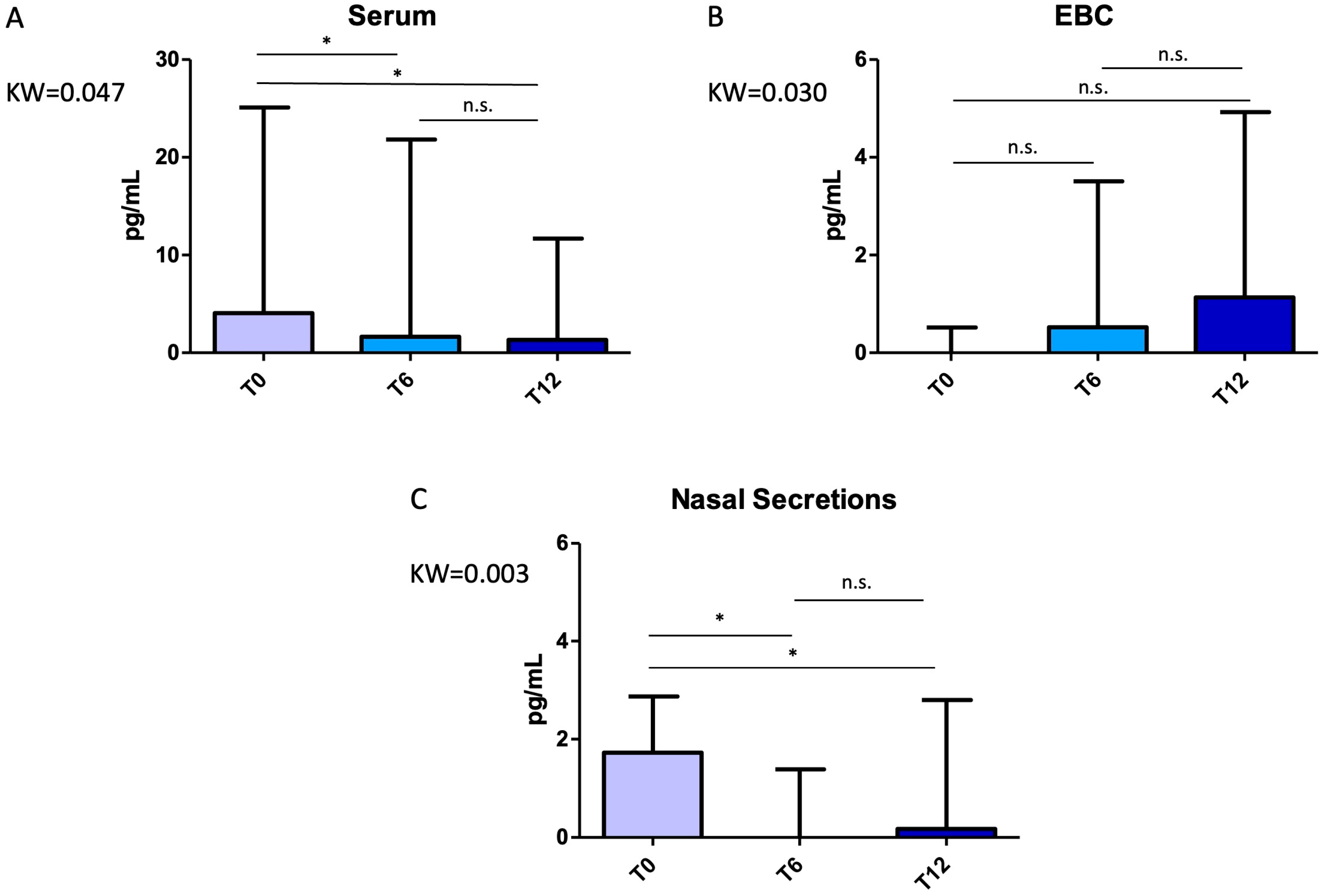 2.2. Impact of Mepolizumab on Cytokine Expression Across Biological Compartments