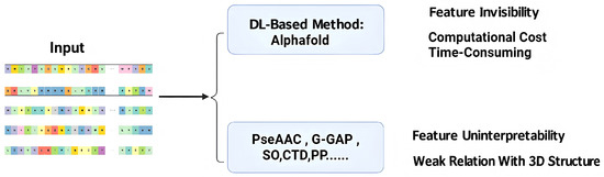 Another line of research, based on traditional machine learning (ML) models, focuses solely on feature engineering on amino acid sequences [10,11]. For instance, amino acid composition (AAC) [12,13] quantifies the frequency of each amino acid, but it fails to adequately link these frequencies to the three-dimensional structure of proteins, significantly limiting its utility in structural analysis. Likewise, pseudo-amino-acid composition (PseAAC) [14,15] incorporates some physicochemical properties; however, it also relies solely on the amino acid sequence, rendering it inadequate for providing comprehensive structural insights. The G-GAP method [16] adopts a different approach but lacks sophistication, treating the amino acid sequence as a string of tokens and counting G-GAP dipeptides in a rudimentary, natural language processing (NLP)-like fashion, thus missing the complex nuances of protein structure. Similarly, methods like sequence order (SO) [17], composition–transition–distribution (CTD) [15], physicochemical property (PP) [18], and Hidden Markov Model (HMM) [19] reflect the narrow focus solely on amino acid sequences. All these approaches underscore a crucial issue—the absence of structure-based feature design. Relying exclusively on amino acid sequence features neglects biologically relevant criteria for screening druggable proteins, ultimately impeding accurate predictions in druggability assessments. Further details are provided in Figure 1.