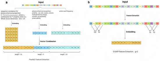 Schematic of feature extraction workflows for two comparative methods. (a) A variant of pseudo-amino acid composition (PseAAC). Three components are extracted and concatenated: (1) a 25-dimensional vector of sequence-order correlation factors derived from 5 physicochemical properties at 5 tiers (); (2) a 5-dimensional vector of physicochemical properties; (3) a 20-dimensional vector of amino acid frequencies. (b) Gapped-dipeptide frequency (). Dipeptide patterns with a gap of 2 amino acids are extracted and their frequencies counted, yielding a 400-dimensional feature vector ( possible combinations).