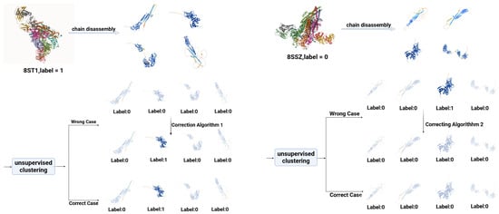 Principle of protein complex disassembly and Correcting Algorithms. Multi-chain complexes are disassembled into individual chains and subjected to unsupervised clustering. Left (Correcting Algorithm 1): For a known drug-binding complex (e.g., 8ST1, label = 1), at least one chain must be labeled positive. If clustering fails to assign any positive label, the chain with the highest secondary structure similarity to the positive centroid is corrected to positive. Right (Correcting Algorithm 2): For complexes with no drug annotations (e.g., 8SSZ, label = 0), all chains are enforced as negative. Any positive labels assigned by clustering are reverted to negative.