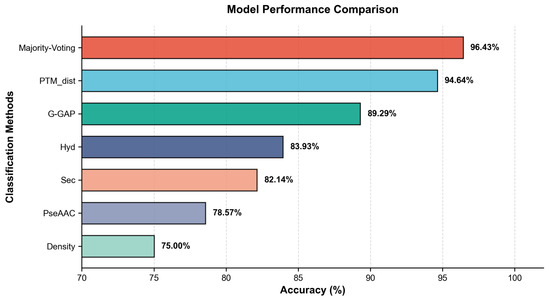 According to Figure 5, our ensemble model, Majority Voting, delivers the highest accuracy (96.43%), indicating that aggregating heterogeneous predictors effectively exploits complementary error patterns and yields robust generalization. The comparative baselines, G-GAP () and PseAAC (), trail substantially: G-GAP captures some residue-order correlations but lacks sufficient contextual breadth, while PseAAC’s coarse compositional encoding proves least informative. The pronounced margin over both baselines underscores the advantage of our ensemble integration strategy.