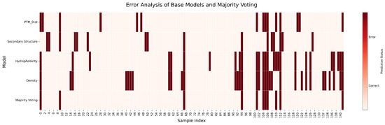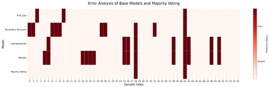 An extended error analysis across the entire dataset in Figure 11 confirms the complementary nature of the base learners. The heat map illustrates that while certain samples prove challenging for most models, the individual error profiles remain largely uncorrelated. This is particularly evident with the Density model, which again correctly identifies samples that are systematically missed by otherwise stronger predictors (PTM Dist, Secondary Structure). This observed diversity in predictive behavior is the cornerstone of successful ensembling. The Majority Voting model leverages this diversity to produce a more robust and accurate classification, as its own error profile is sparser than that of any individual constituent model.