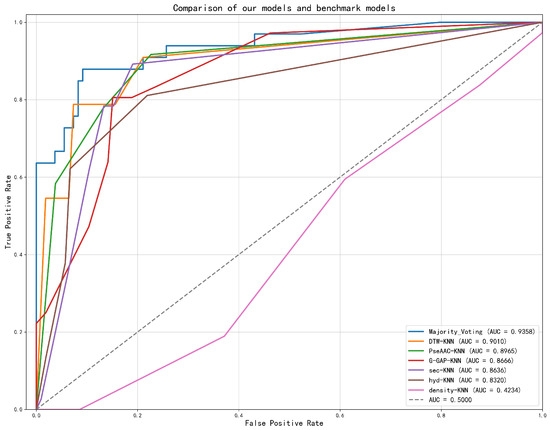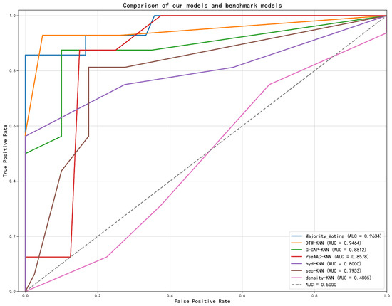 Receiver Operating Characteristic (ROC) analysis revealed that the proposed Majority Voting ensemble (AUC = ) substantially outperformed its constituent base models and established benchmarks, such as G-GAP + KNN (AUC = 0.8812) and PseAAC + KNN (AUC = 0.8578), as shown in Figure 7. This highlights the synergistic benefit of ensembling heterogeneous feature sets.